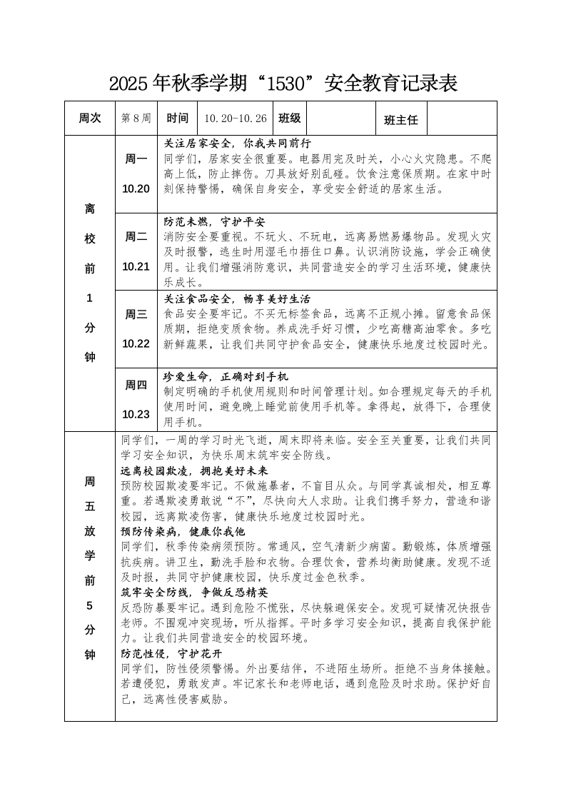 2025年秋季学期“1530”安全教育记录表周次第8周时间10.20-10.26班级班主任关注居家安全,你我共同前行周一同学们,居家安全很重要。电器用完及时关,小心火灾隐患。不爬高上低,防止摔伤。刀具放好别乱碰。饮食注意保质期。在家中时10.20刻保持警惕,确保自身安全,享受安全舒适的居家生活。离防范未燃,守护平安校周二消防安全要重视。不玩火、不玩电,远离易燃易爆物品。发现火灾及时报警,逃生时用湿毛巾捂住口鼻。认识消防设施,学会正确使前10.21用。让我们增强消防意识,共同营造安全的学习生活环境,健康快乐成长。1关注食品安全,畅享美好生活周三食品安全要牢记。不买无标签食品,远离不正规小摊。留意食品保分质期,拒绝变质食物。养成洗手好习惯,少吃高糖高油零食。多吃10.22新鲜蔬果,让我们共同守护食品安全,健康快乐地度过校园时光。钟珍爱生命,正确对到手机周四制定明确的手机使用规则和时间管理计划。如合理规定每天的手机使用时间,避免晚上睡觉前使用手机等。拿得起,放得下,合理使10.23用手机。同学们,一周的学习时光飞逝,周末即将来临。安全至关重要,让我们共同学习安全知识,为快乐周末筑牢安全防线。远离校园欺凌,拥抱美好未来周预防校园欺凌要牢记。不做施暴者,不盲目从众。与同学真诚相处,相互尊五重。若遇欺凌勇敢说“不”,尽快向大人求助。让我们携手努力,营造和谐校园,远离欺凌伤害,健康快乐地度过校园时光。放预防传染病,健康你我他同学们,秋季传染病须预防。常通风,空气清新少病菌。勤锻炼,体质增强学抗疾病。讲卫生,勤洗手脸和衣物。合理饮食,营养均衡助健康。发现不适前及时报,共同守护健康校园,快乐度过金色秋季。筑牢安全防线,争做反恐精英5反恐防暴要牢记。遇到危险不慌张,尽快躲避保安全。发现可疑情况快报告分老师。不围观冲突现场,听从指挥。平时多学习安全知识,提高自我保护能力。让我们共同营造安全的校园环境。钟防范性侵,守护花开同学们,防性侵须警惕。外出要结伴,不进陌生场所。拒绝不当身体接触。若遭侵犯,勇敢发声。牢记家长和老师电话,遇到危险及时求助。保护好自己,远离性侵害威胁。