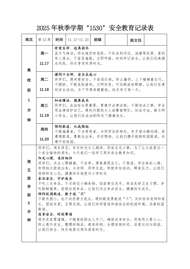 2025年秋季学期“1530”安全教育记录表周次第12周时间11.17-11.23班级班主任珍爱生命,远离溺水周一虽天气转凉,但水域仍有危险。不私自到河边、池塘等玩耍。看到有人落水,不盲目施救,立即呼救。时刻牢记安全,让我们远离溺11.17水风险,快乐享受秋季时光。离课间十分钟,安全在我心校周二同学们,课间要安全。不追逐打闹,防止撞伤。上下楼梯靠右行,不拥挤。不做危险游戏。文明休息,可远眺放松眼睛。让我们在课前11.18间安全活动,为下节课养精蕾锐,快乐学习每一天。知法懂法,健康成长周三同学们,法治安全很重要。要遵守法律法规,不做违法之事。学会分用法律保护自己,遇到问题找大人或警察帮忙。知法守法,做文明11.19小学生,让我们在法治的阳光下健康成长。钟预防欺凌,从我做起周四不做施暴者,不当旁观者。与同学友好相处,有矛盾冷静沟通。若遭遇欺凌,勇敢站出来,寻求帮助。让我们携手抵制校园欺凌,共11.20建平安校园。同学们,周末将至,欢乐时光令人期待。但安全无小事,为了让大家度过一个安全愉快的周末,今天我们一起学习周末安全教育知识。阳光心理,美好相伴周同学们,关注心理健康。不自卑,勇敢展现自己。不焦虑,学会放松心情。五有烦恼大胆说出来,与老师、同学交流。积极参加活动,释放压力。让我们保持阳光心态,健康快乐地度过小学时光放食品安全,守护成长学不吃三无食品,不买街边小摊食物。饭前便后洗手,养成良好卫生习惯。多吃新鲜蔬果,拒绝垃圾食品。让我们关注食品安全,健康快乐成长。前预防校园欺凌,敢于说“不”不欺负弱小,也不向恶势力低头。遇到欺凌勇敢说“不”,及时告诉老师和家5长。团结友爱,互帮互助,让我们共同营造和谐安全的校园环境,远离校园分欺凌。居家安全,时刻警惕钟周末在家需谨慎。不随意给陌生人开门,确保自身安全。用电用火要小心,防止意外发生。整理好物品,避免绊倒。合理安排时间,适度运动与阅读。让我们安全、快乐地度过周末居家时光。