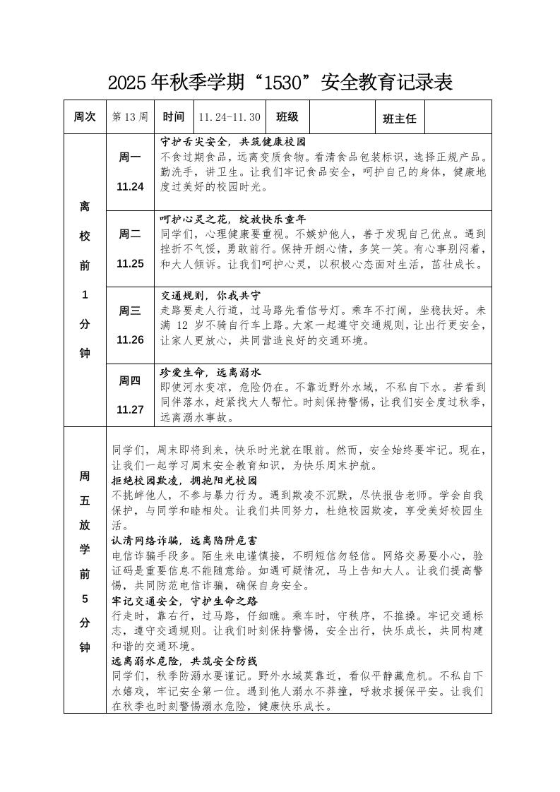 2025年秋季学期“1530”安全教育记录表周次第13周时间11.24-11.30班级班主任守护舌尖安全,共筑健康校园周一不食过期食品,远离变质食物。看清食品包装标识,选择正规产品。勤洗手,讲卫生。让我们牢记食品安全,呵护自己的身体,健康地11.24度过美好的校园时光。离呵护心灵之花,绽放快乐童年校周二同学们,心理健康要重视。不嫉妒他人,善于发现自己优点。遇到挫折不气馁,勇敢前行。保持开朗心情,多笑一笑。有心事别闷着,前11.25和大人倾诉。让我们呵护心灵,以积极心态面对生活,茁壮成长。交通规则,你我共守周三走路要走人行道,过马路先看信号灯。乘车不打闹,坐稳扶好。未满12岁不骑自行车上路。大家一起遵守交通规则,让出行更安全,11.26让家人更放心,共同营造良好的交通环境。钟珍爱生命,远离溺水周四即使河水变凉,危险仍在。不靠近野外水域,不私自下水。若看到同伴落水,赶紧找大人帮忙。时刻保持警惕,让我们安全度过秋季,11.27远离溺水事故。同学们,周末即将到来,快乐时光就在眼前。然而,安全始终要牢记。现在,让我们一起学习周末安全教育知识,为快乐周末护航。周拒绝校园欺凌,拥抱阳光校园五不挑衅他人,不参与暴力行为。遇到欺凌不沉默,尽快报告老师。学会自我保护,与同学和睦相处。让我们共同努力,杜绝校园欺凌,享受美好校园生放活。学认清网络诈骗,远离陷阱危害电信诈骗手段多。陌生来电谨慎接,不明短信勿轻信。网络交易要小心,验前证码是重要信息不能随意给。如遇可疑情况,马上告知大人。让我们提高警惕,共同防范电信诈骗,确保自身安全。5牢记交通安全,守护生命之路分行走时,靠右行,过马路,仔细瞧。乘车时,守秩序,不推搡。牢记交通标志,遵守交通规则。让我们时刻保持警惕,安全出行,快乐成长,共同构建钟和谐的交通环境。远离溺水危险,共筑安全防线同学们,秋季防溺水要谨记。野外水域莫靠近,看似平静藏危机。不私自下水嬉戏,牢记安全第一位。遇到他人溺水不莽撞,呼救求援保平安。让我们在秋季也时刻警惕溺水危险,健康快乐成长。