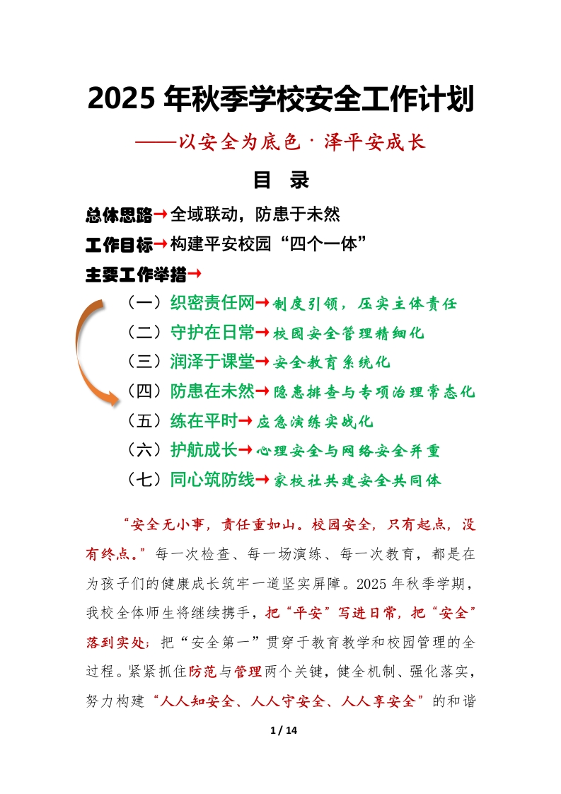 2025年秋季学校安全工作计划—以安全为底色·泽平安成长目录总体思路→全域联动,防患于未然工作目标→构建平安校园“四个一体”主要工作举措→(一)织密责任网→制度引领,压实主体责任(二)守护在日常→校园安全管理精细化(三)润泽于课堂→安全教育条统化(四)防患在未然→隐患排查与专项治理常态化(五)练在平时→应急演练实战化(六)护航成长→心理安全与网络安全并重(七)同心筑防线→家校社共建安全共同体“安全无小事,责任重如山。校园安全,只有起点,没有终点。”每一次检查、每一场演练、每一次教育,都是在为孩子们的健康成长筑牢一道坚实屏障。2025年秋季学期,我校全体师生将继续携手,把“平安”写进日常,把“安全”落到实处;把“安全第一”贯穿于教育教学和校园管理的全过程。紧紧抓住防范与管理两个关键,健全机制、强化落实,努力构建“人人知安全、人人守安全、人人享安全”的和谐1/14