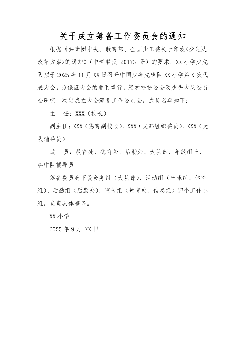 关于成立筹备工作委员会的通知根据《共青团中央、教育部、全国少工委关于印发<少先队改革方案>的通知》(中青联发20173号)的要求,XX小学少先队拟于2025年11月XX日召开中国少年先锋队XX小学第X次代表大会。为保证大会的顺利举行,经学校校委会及少先大队委员会研究,决定成立大会筹备工作委员会,成员名单如下:主任:XXX(校长)副主任:XXX(德育副校长)、XXX(支部组织委员)、XXX(大队辅导员)成员:教育处、德育处、后勤处、大队部、年级组长、各中队辅导员筹备委员会下设会务组(大队部)、活动组(音乐组、体育组)、后勤组(后勤处)、宣传组(教育处、信息组)四个工作小组,负责具体事务。XX小学2025年9月XX日