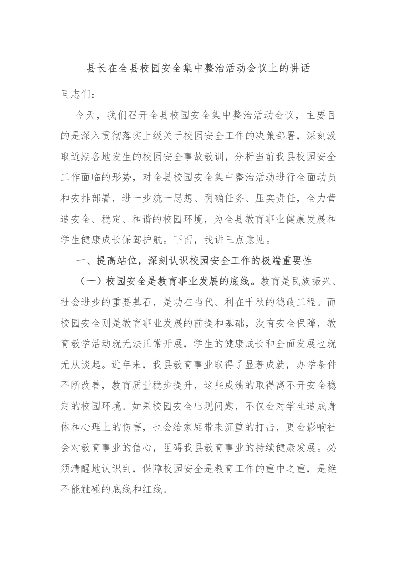 县长在全县校园安全集中整治活动会议上的讲话同志们:今天,我们召开全县校园安全集中整治活动会议,主要目的是深入贯彻落实上级关于校园安全工作的决策部署,深刻汲取近期各地发生的校园安全事故教训,分析当前我县校园安全工作面临的形势,对全县校园安全集中整治活动进行全面动员和安排部署,进一步统一思想、明确任务、压实责任,全力营造安全、稳定、和谐的校园环境,为全县教育事业健康发展和学生健康成长保驾护航。下面,我讲三点意见。一、提高站位,深刻认识校园安全工作的极端重要性(一)校园安全是教育事业发展的底线。教育是民族振兴、社会进步的重要基石,是功在当代、利在千秋的德政工程。而校园安全则是教育事业发展的前提和基础,没有安全保障,教育教学活动就无法正常开展,学生的健康成长和全面发展也就无从谈起。近年来,我县教育事业取得了显著成就,办学条件不断改善,教育质量稳步提升,这些成绩的取得离不开安全稳定的校园环境。如果校园安全出现问题,不仅会对学生造成身体和心理上的伤害,也会给家庭带来沉重的打击,更会影响社会对教育事业的信心,阻碍我县教育事业的持续健康发展。必须清醒地认识到,保障校园安全是教育工作的重中之重,是绝不能触碰的底线和红线。