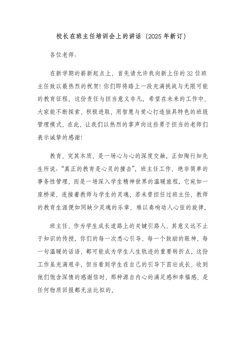 校长在班主任培训会上的讲话(2025年新订)各位老师:在新学期的崭新起点上,首先请允许我向新上任的32位班主任致以最热烈的祝贺!你们即将踏上一段充满挑战与无限可能的教育征程,这份责任与担当意义非凡。希望在未来的工作中,大家能不断探索、积极进取,用智慧与爱心打造独具特色的班级管理模式,在此,让我们以热烈的掌声向这些勇于担当的老师们表示诚挚的感谢!教育,究其本质,是一场心与心的深度交融。正如陶行知先生所说:“真正的教育是心灵的撞击”。班主任工作,绝非简单的事务性管理,而是一场深入学生精神世界的温暖旅程。它宛如一座桥梁,连接着教师与学生的灵魂,若未曾担任过班主任,教师的教育生涯便如同缺少灵魂的乐章,难以奏响动人心弦的旋律。班主任,作为学生成长道路上的关键引路人,其意义远不止于知识的传授。你们的每一次悉心引导、每一个鼓励的眼神、每一句温暖的话语,都可能成为学生人生轨迹的重要转折点。这份工作虽充满艰辛,但当看到学生在自己的引导下茁壮成长,收到他们饱含深情的感谢信时,那种源自内心的满足感和幸福感,是任何物质回报都无法比拟的。