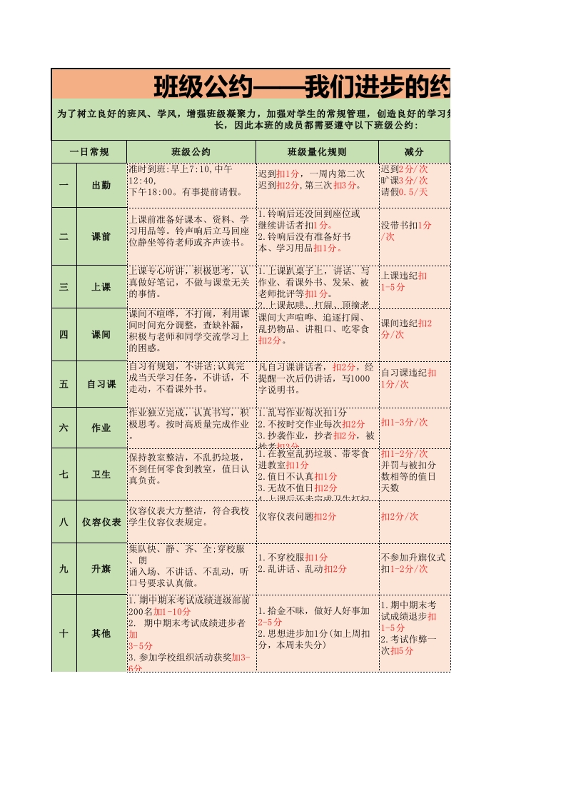 班级公约我们进步的约为了树立良好的班风、学风,增强班级凝聚力,加强对学生的常规管理,创造良好的学习长,因此本班的成员都需要遵守以下班级公约:一日常规班级公约班级量化规则迟到扣1分,一周内第二次12:40,迟到扣2分,第三次扣3分。:旷课3分/次下午18:00。有事提前请假。请假0.5/天:上课前准备好课本、资料、学习用品等。铃声响后立马回座继续讲话者扣1分。没带书扣1分二课前位静坐等待老师或齐声读书。2.铃响后没有准备好书/次本、学习用品扣1分。:上课违纪扣三上课其做好笔记,不做与课堂无关作业、看课外书、发呆、被的事情。老师批评等扣1分。1-5分课间大声喧哗、追逐打闹、间时间充分调整,查缺补漏,课间违纪扣2四课间乱扔物品、讲粗口、吃零食积极与老师和同学交流学习上的困惑。扣2分。分/次五自习课成当天学习任务,不讲话,不提醒一次后仍讲话,写1000自习课违纪扣走动,不看课外书。字说明书。1分/次六作业极思考。按时高质量完成作业2.不按时交作业每次扣2分扣1-3分/次3.抄袭作业,抄者扣2分,被保持教室整洁,不乱扔垃圾,七卫生不到任何零食到教室,值日认进教室扣1分:并罚与被扣分真负责。2.值日不认其扣1分数相等的值日3.无故不值日扣2分天数仪容仪表大方整洁,符合我校八仪容仪表学生仪容仪表规定。仪容仪表问题扣2分扣2分/次朗1.不穿校服扣1分不参加升旗仪式九升旗诵入场、不讲话、不乱动,听:2.乱讲话、乱动扣2分扣1-2分/次口号要求认真做。1.期中期末考:200名加1-10分1.拾金不昧,做好人好事加试成绩退步扣2.期中期末考试成绩进步者2-5分其他2.思想进步加1分(如上周扣1-5分2.考试作弊一分,本周未失分)3.参加学校组织活动获奖加3:次5分