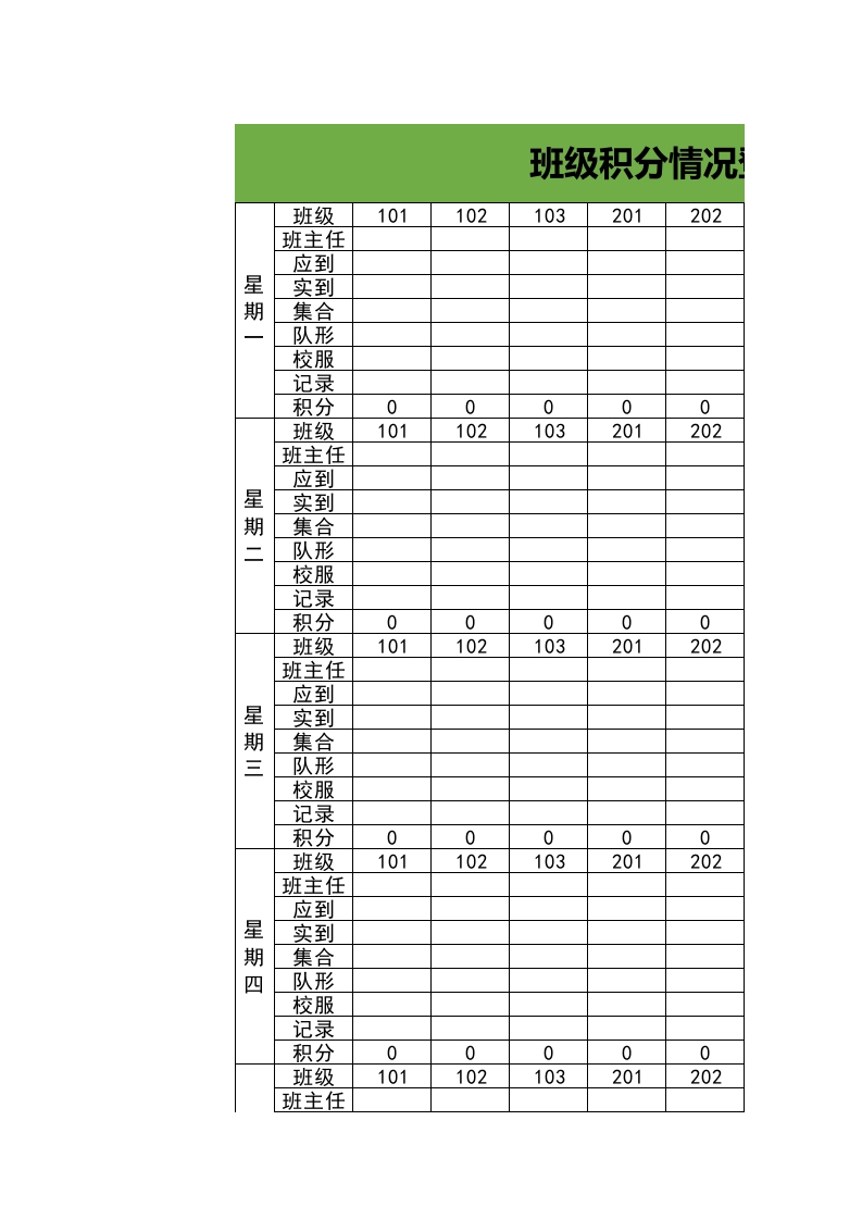 班级积分情况班级101102103201202班主任应到星实到期集合队形校服记录积分00000班级101102103201202班主任应到星实到期集合二队形校服记录积分00000班级101102103201202班主任应到星实到期集合队形校服记录积分00000班级101102103201202班主任应到星实到期集合四队形校服记录积分0000班级101102103201202班主任