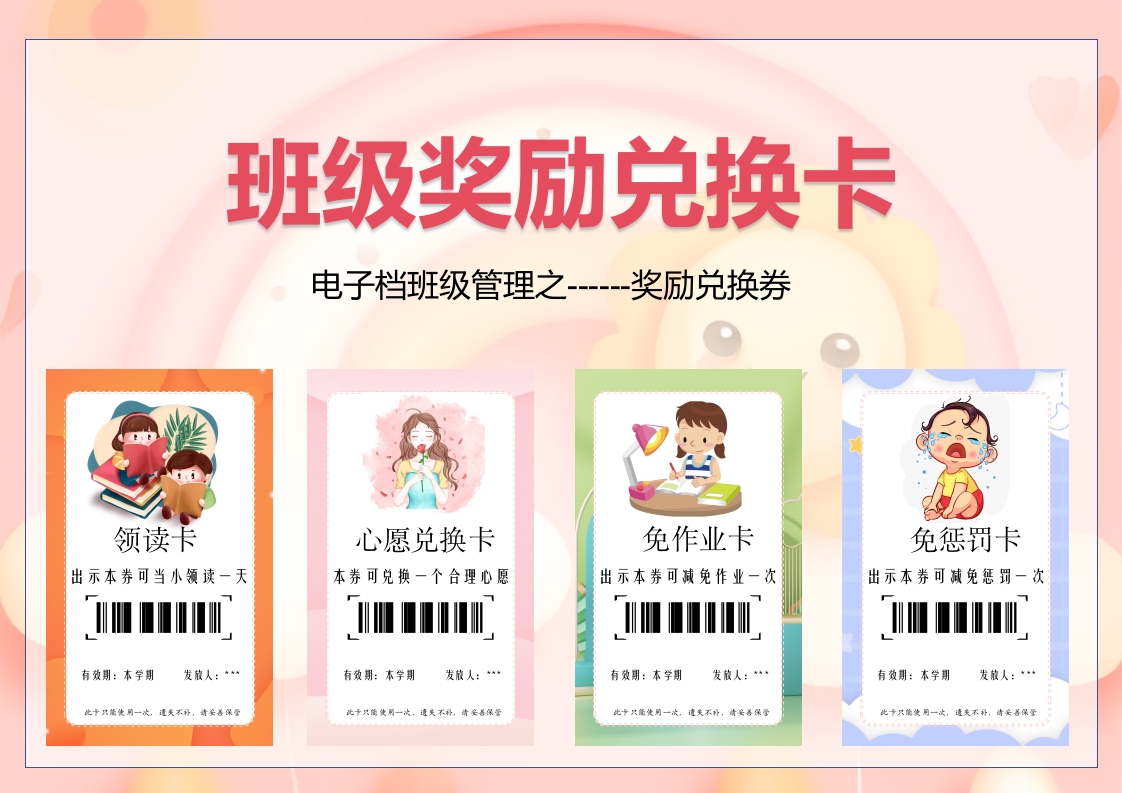 班级奖励兑换卡电子档班级管理之---奖励兑换券领读卡心愿兑换卡免作业卡免惩罚卡出示本券可当小领读一天本券可兑换一个合理心愿出示本券可减免作业一次出示本券可减免惩罚一次有效期:本学期有效期:本学期有效期:本学期有效期:本学期