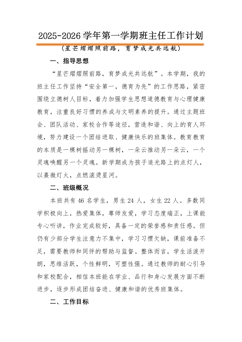 2025-2026学年第一学期班主任工作计划(星芒熠熠照前路,育梦成光共远航)一、指导思想“星芒熠熠照前路,育梦成光共远航”。本学期,我的班主任工作坚持“安全第一,德育为先”的工作思路,紧密围绕立德树人目标,着力加强学生思想道德教育与心理健康教育,注重良好习惯的养成与文明素养的提升。通过主题班会、团队活动、家校合作等途径,营造和谐、向上的育人环境,努力建设一个团结进取、健康快乐的班集体。教育教育的本质是一棵树摇动另一棵树,一朵云推动另一朵云,一个灵魂唤醒另一个灵魂。新学期成为孩子追光路上的点灯人,以熹微灯火,点燃滚烫星河。二、班级概况本班共有46名学生,男生24人,女生22人。多数同学积极向上,热爱集体,尊师友爱,学习态度端正,上课能专心听讲,作业完成较好,具备一定的荣誉感和责任感。但仍有少部分学生注意力不集中,学习习惯欠缺,课前准备不足,需要教师和同伴的帮助与监督。整体而言,学生活泼开朗,思维活跃,个性鲜明,可塑性强。通过教师的耐心引导和家校配合,相信本班能在学业、品行和身心发展方面不断进步,逐步形成团结奋进、健康和谐的优秀班集体。二、工作目标