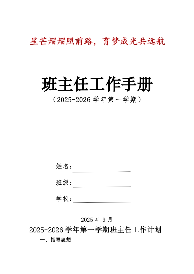 星芒熠熠照前路,育梦成光共远航班主任工作手册(2025-2026学年第一学期)姓名:班级:学校:2025年9月2025-2026学年第一学期班主任工作计划一、指导思想