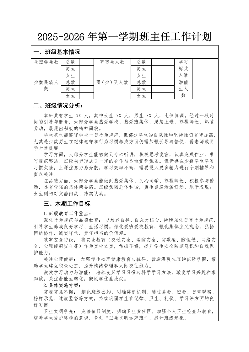 2025-2026年第一学期班主任工作计划一、班级基本情况全班学生数总数寄宿生人数总数学习男生男生标兵女生女生人数少数民族人总数团(少)队人数总数潜能数男生男生生人女生女生数二、班级情况分析:本班共有学生XX人,其中女生XX人,男生XX人,比例协调。经过一段时间的引导与磨合,大部分学生热爱学校、热爱班集体,思想上进,尊敬师长,热爱劳动,展现出积极的精神面貌。学生基本能遵守学校一日行为规范,但部分学生的自觉性和坚持性仍有待提高,尤其是少数男生在纪律遵守和行为习惯养成方面仍需加强引导与督促,需老师或同学时常提醒。学习方面,大部分学生能够做到专心听讲,积极思考发言,认真完成作业,书写规范整洁。班级初步形成了一定的合作与良性竞争氛围。但仍存在少数学生学习习惯欠佳,上课注意力易分散,学习效率不高,需要投入更多精力进行个别辅导和重点关注。在品德方面,大部分学生能做到热爱集体、关心同学、尊敬师长、积极参与劳动,具有较强的集体荣誉感。班级氛围总体和谐,男生普遍活泼好动、乐于表现;女生则相对文静内敛、踏实认真。三、本期工作目标1.班级教育工作重点:深化行为规范与品德教育:以培养自律、自强为核心,持续强化日常行为规范,引导学生养成良好学习、生活习惯。深化爱班爱校教育,强化集体主义观念,弘扬团结协作、诚实守信、责任担当的价值观。筑牢安全防线:将安全教育(交通安全、消防安全、防欺凌、防性侵、网络安全、心理健康安全等)作为重中之重,常抓不懈,提升学生安全防范意识和自我保护能力。关注心理健康:加强学生心理健康教育与疏导,营造温暖包容的班级氛围,帮助学生建立积极心态,提升情绪管理和人际交往能力。激发学习动力与潜能:培养良好学习习惯与科学学习方法,激发学习兴趣和求知欲,关注潜能生转化,鼓励学优生拔尖。2.具体实施方案:常规常抓不懈:细化班级公约,明确奖惩机制。通过晨会、班会、日常观察、榜样示范、适度监督等方式,持续巩固学生在纪律、卫生、礼仪、学习等方面的良好习惯。卫生文明争先:完善值日制度,明确卫生责任区。加强个人卫生检查与教育,培养学生爱护环境的意识,争创“卫生文明示范班”,提升班级形象。