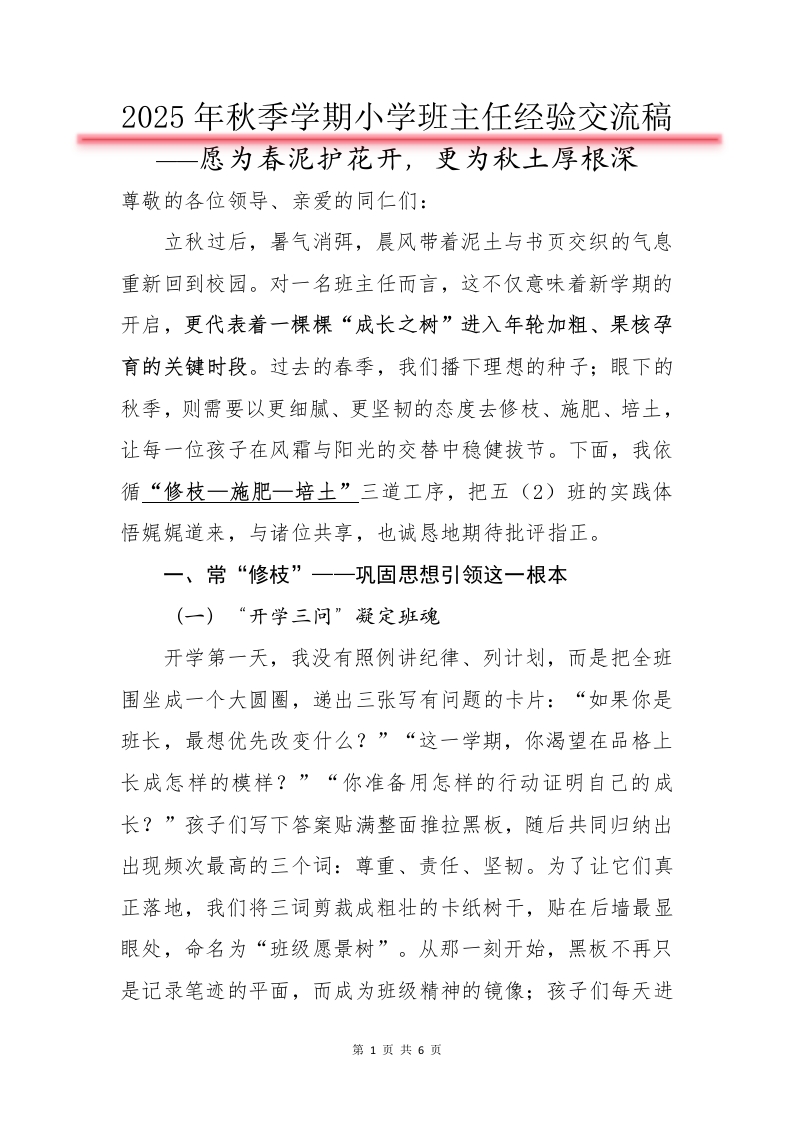 2025年秋季学期小学班主任经验交流稿愿为春泥护花开,更为秋土厚根深尊敬的各位领导、亲爱的同仁们:立秋过后,暑气消弭,晨风带着泥土与书页交织的气息重新回到校园。对一名班主任而言,这不仅意味着新学期的开启,更代表着一棵棵“成长之树”进入年轮加粗、果核孕育的关键时段。过去的春季,我们播下理想的种子;眼下的秋季,则需要以更细腻、更坚韧的态度去修枝、施肥、培土,让每一位孩子在风霜与阳光的交替中稳健拔节。下面,我依循“修枝一施肥一培土”三道工序,把五(2)班的实践体悟娓娓道来,与诸位共享,也诚恳地期待批评指正。一、常“修枝”一一巩固思想引领这一根本(一)“开学三问”凝定班魂开学第一天,我没有照例讲纪律、列计划,而是把全班围坐成一个大圆圈,递出三张写有问题的卡片:“如果你是班长,最想优先改变什么?”“这一学期,你渴望在品格上长成怎样的模样?”“你准备用怎样的行动证明自己的成长?”孩子们写下答案贴满整面推拉黑板,随后共同归纳出出现频次最高的三个词:尊重、责任、坚韧。为了让它们真正落地,我们将三词剪裁成粗壮的卡纸树干,贴在后墙最显眼处,命名为“班级愿景树”。从那一刻开始,黑板不再只是记录笔迹的平面,而成为班级精神的镜像;孩子们每天进第1页共6页