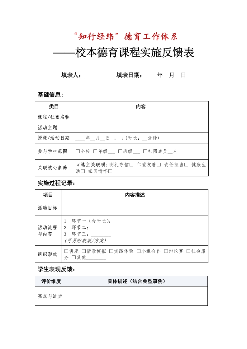 “知行经纬”德育工作体系校本德育课程实施反馈表填表人:填表日期:年月日基础信息:类目内容课程/社团名称活动主题授课/活动日期年月日:-:(时长:分钟)参与学生范围口全校口年级口班级口社团成员人关联核心素养√选主关联项:明礼守信口仁爱友善口责任担当口健康生活口家国情怀口实施过程记录:项目内容描述活动目标1.环节一(含时长):活动流程2.环节二:与内容3.环节三:(可另附教案/方案)组织形式口讲座口情景模拟口实践体验口小组合作口辩论赛口社会服务口其他学生表现反馈:评价维度具体描述(结合典型事例)亮点与进步