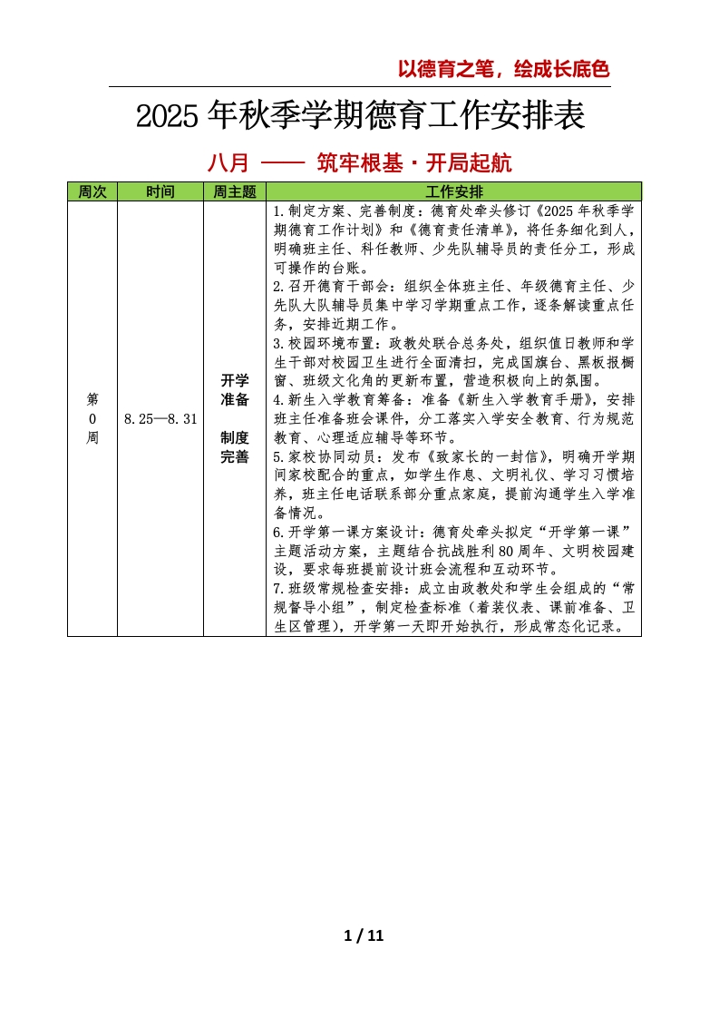 以德育之笔,绘成长底色2025年秋季学期德育工作安排表八月筑牢根基·开局起航周次时间周主题工作安排1.制定方案、完善制度:德育处牵头修订《2025年秋季学期德育工作计划》和《德育责任清单》,将任务细化到人,明确班主任、科任教师、少先队辅导员的责任分工,形成可操作的台账。2.召开德育干部会:组织全体班主任、年级德育主任、少先队大队辅导员集中学习学期重点工作,逐条解读重点任务,安排近期工作。3.校园环境布置:政教处联合总务处,组织值日教师和学生干部对校园卫生进行全面清扫,完成国旗台、黑板报橱开学窗、班级文化角的更新布置,营造积极向上的氛围。第准备4.新生入学教育筹备:准备《新生入学教育手册》,安排0周8.25-8.31班主任准备班会课件,分工落实入学安全教育、行为规范制度教育、心理适应辅导等环节。完善5.家校协同动员:发布《致家长的一封信》,明确开学期间家校配合的重点,如学生作息、文明礼仪、学习习惯培养,班主任电话联系部分重点家庭,提前沟通学生入学准备情况。6.开学第一课方案设计:德育处牵头拟定“开学第一课”主题活动方案,主题结合抗战胜利80周年、文明校园建设,要求每班提前设计班会流程和互动环节。7.班级常规检查安排:成立由政教处和学生会组成的“常规督导小组”,制定检查标准(着装仪表、课前准备、卫生区管理),开学第一天即开始执行,形成常态化记录。1/11