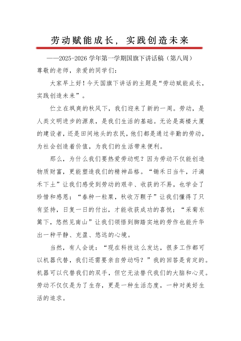 劳动赋能成长,实践创造未来2025-2026学年第一学期国旗下讲话稿(第八周)尊敬的老师,亲爱的同学们:大家早上好!今天国旗下讲话的主题是“劳动赋能成长,实践创造未来”。伫立在飒爽的秋风下,我们迎来了新的一周。劳动,是人类文明进步的源泉,是我们生活的基础。无论是高楼大厦的建设者,还是田间地头的农民,他们都是通过辛勤的劳动,为社会创造着价值,为我们的生活带来便利。那么,为什么我们要热爱劳动呢?因为劳动不仅能创造物质财富,更能塑造我们的精神品格。“锄禾日当午,汗滴禾下土”让我们感受到劳动的艰辛、收获的不易,也学会了珍惜和感恩;“春种一粒粟,秋收万颗子”让我们懂得了只有坚持,日复一日的付出,才能收获成功的喜悦;“采菊东篱下,悠然见南山”让我们领悟到脚踏实地的劳作也能升华出一种平静、充盈、悠远的心境。当然,有人会说:“现在科技这么发达,很多工作都可以机器代替,我们还需要亲自劳动吗?”我的回答是肯定的。机器可以代替我们的双手,但它无法替代我们的大脑和心灵。劳动不仅仅是为了生存,更是一种生活态度,一种对美好生活的追求。
