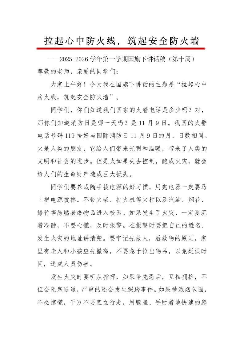 拉起心中防火线,筑起安全防火墙2025-2026学年第一学期国旗下讲话稿(第十周)尊敬的老师,亲爱的同学们:大家上午好!今天我在国旗下讲话的主题是“拉起心中房火线,筑起安全防火墙”。同学们,你们知道我们国家的火警电话是多少吗?对,那你们知道消防日是哪一天吗?是11月9日。我国的火警电话号码119恰好与国际消防日11月9日的月、日数相同。火是人类的朋友,它给人们带来光明和温暖,带来了人类的文明和社会的进步。但是火如果失去控制,酿成火灾,就会给人们的生命财产造成巨大损失。同学们要养成随手拔电源的好习惯,用完电器一定要马上把电源拔掉。不带火柴、打火机等火种以及汽油、烟花、爆竹等易燃易爆物品进入校园。如果发生了火灾,一定要沉着冷静,不要心慌,及时报警。在报警时要把自己的姓名、发生火灾的地址讲清楚。要牢记先救人,后救物的原则,家里有老人和小孩应先撤离,不要急于抢出物品,以免延误时间,造成人员伤害。发生火灾时要听从指挥,如果争先恐后,互相拥挤,不但会阻塞通道,严重的还会发生踩踏事件。如果被浓烟包围,不必惊慌,千万不要直立行走,用膝盖、手肘着地快速的爬