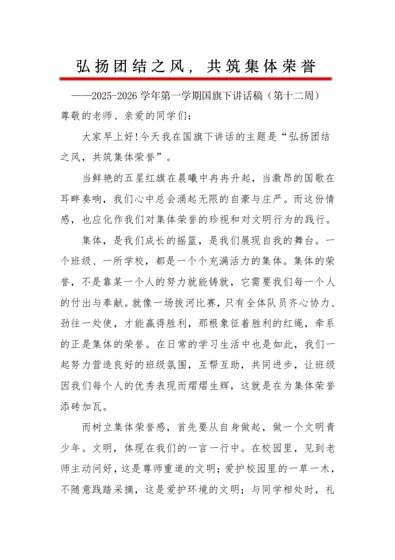 弘扬团结之风,共筑集体荣誉2025-2026学年第一学期国旗下讲话稿(第十二周)尊敬的老师、亲爱的同学们:大家早上好!今天我在国旗下讲话的主题是“弘扬团结之风,共筑集体荣誉”。当鲜艳的五星红旗在晨曦中冉冉升起,当激昂的国歌在耳畔奏响,我们心中总会涌起无限的自豪与庄严。而这份情感,也应化作我们对集体荣誉的珍视和对文明行为的践行。集体,是我们成长的摇篮,是我们展现自我的舞台。一个班级、一所学校,都是一个个充满活力的集体。集体的荣誉,不是靠某一个人的努力就能铸就,它需要我们每一个人的付出与奉献。就像一场拔河比赛,只有全体队员齐心协力、劲往一处使,才能赢得胜利,那根象征着胜利的红绳,牵系的正是集体的荣誉。在日常的学习生活中也是如此,我们一起努力营造良好的班级氛围,互帮互助,共同进步,让班级因我们每个人的优秀表现而熠熠生辉,这就是在为集体荣誉添砖加瓦。而树立集体荣誉感,首先要从自身做起,做一个文明青少年。文明,体现在我们的一言一行中。在校园里,见到老师主动问好,这是尊师重道的文明;爱护校园里的一草一木,不随意践踏采摘,这是爱护环境的文明;与同学相处时,礼