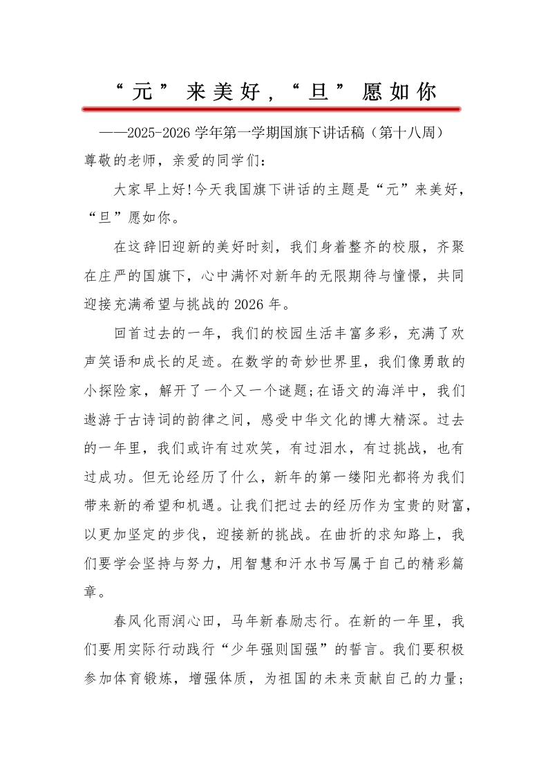 “元”来美好,“旦”愿如你一一2025-2026学年第一学期国旗下讲话稿(第十八周)尊敬的老师,亲爱的同学们:大家早上好!今天我国旗下讲话的主题是“元”来美好,“旦”愿如你。在这辞旧迎新的美好时刻,我们身着整齐的校服,齐聚在庄严的国旗下,心中满怀对新年的无限期待与憧憬,共同迎接充满希望与挑战的2026年。回首过去的一年,我们的校园生活丰富多彩,充满了欢声笑语和成长的足迹。在数学的奇妙世界里,我们像勇敢的小探险家,解开了一个又一个谜题;在语文的海洋中,我们遨游于古诗词的韵律之间,感受中华文化的博大精深。过去的一年里,我们或许有过欢笑,有过泪水,有过挑战,也有过成功。但无论经历了什么,新年的第一缕阳光都将为我们带来新的希望和机遇。让我们把过去的经历作为宝贵的财富,以更加坚定的步伐,迎接新的挑战。在曲折的求知路上,我们要学会坚持与努力,用智慧和汗水书写属于自己的精彩篇章。春风化雨润心田,马年新春励志行。在新的一年里,我们要用实际行动践行“少年强则国强”的誓言。我们要积极参加体育锻炼,增强体质,为祖国的未来贡献自己的力量: