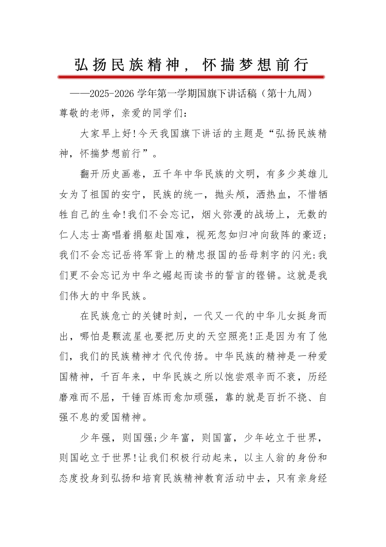 弘扬民族精神,怀揣梦想前行2025-2026学年第一学期国旗下讲话稿(第十九周)尊敬的老师,亲爱的同学们:大家早上好!今天我国旗下讲话的主题是“弘扬民族精神,怀揣梦想前行”。翻开历史画卷,五千年中华民族的文明,有多少英雄儿女为了祖国的安宁,民族的统一,抛头颅,洒热血,不惜牺牲自己的生命!我们不会忘记,烟火弥漫的战场上,无数的仁人志士高唱着捐躯赴国难,视死忽如归冲向敌阵的豪迈:我们不会忘记岳将军背上的精忠报国的岳母刺字的闪光:我们更不会忘记为中华之崛起而读书的誓言的铿锵。这就是我们伟大的中华民族。在民族危亡的关键时刻,一代又一代的中华儿女挺身而出,哪怕是颗流星也要把历史的天空照亮!正是因为有了他们,我们的民族精神才代代传扬。中华民族的精神是一种爱国精神,千百年来,中华民族之所以饱尝艰辛而不衰,历经磨难而不屈,干锤百炼而愈加顽强,靠的就是百折不挠、自强不息的爱国精神。少年强,则国强;少年富,则国富,少年屹立于世界,则国屹立于世界!让我们积极行动起来,以主人翁的身份和态度投身到弘扬和培育民族精神教育活动中去,只有亲身经