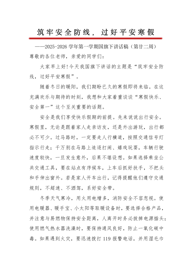 筑牢安全防线,过好平安寒假一一2025-2026学年第一学期国旗下讲话稿(第廿二周)尊敬的各位老师,亲爱的同学们:大家早上好!今天我国旗下讲话的主题是“筑牢安全防线,过好平安寒假”。随着冬日的暖阳,我们期盼已久的寒假即将来临。在这充满欢乐与期待的时刻,我想和大家着重谈谈“寒假快乐、安全第一”这个至关重要的话题。安全是我们享受快乐假期的前提。先来说说出行安全。寒假里,无论是跟着家人走亲访友,还是外出游玩,出行都必不可少。过马路时,一定要走人行横道,按照交通信号灯指示行走:千万别在马路上追逐打闹、嬉戏玩耍,车辆行驶速度较快,一旦发生意外,后果不堪设想。如果选择乘坐公共交通工具,要在站点有序候车,上车后抓好扶手,不把头和手伸出窗外。若是家人开车出行,记得提醒他们遵守交通规则,不超速、不酒驾,系好安全带。冬季天气寒冷,用火用电增多,消防安全不容忽视。使用电暖器、暖手宝、小太阳等取暖设备时,要选择合格产品,并注意与易燃物保持安全距离,人离开时务必拔掉电源插头;使用燃气热水器洗澡时,要保持通风良好,防止一氧化碳中毒。如果遇到火灾,要迅速拨打119报警电话,并用湿毛巾