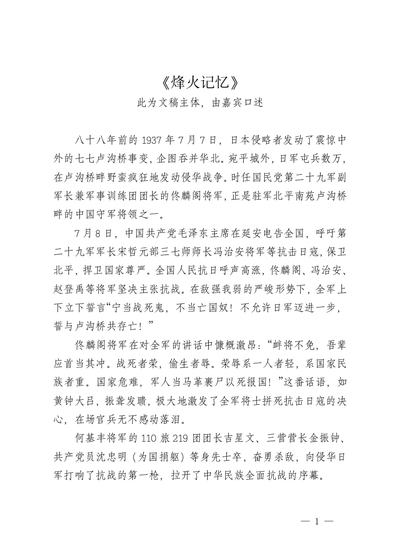 《烽火记忆》此为文稿主体,由嘉宾口述八十八年前的1937年7月7日,日本侵略者发动了震惊中外的七七卢沟桥事变,企图吞并华北。宛平城外,日军屯兵数万,在卢沟桥畔野蛮疯狂地发动侵华战争。时任国民党第二十九军副军长兼军事训练团团长的佟麟阁将军,正是驻军北平南苑卢沟桥畔的中国守军将领之一。7月8日,中国共产党毛泽东主席在延安电告全国,呼吁第二十九军军长宋哲元部三七师师长冯治安将军等抗击日寇,保卫北平,捍卫国家尊严。全国人民抗日呼声高涨,佟麟阁、冯治安、赵登禹等将军坚决主张抗战。在敌强我弱的严峻形势下,全军上下立下誓言“宁当战死鬼,不当亡国奴!不允许日军迈进一步,誓与卢沟桥共存亡!”佟麟阁将军在对全军的讲话中慷概激昂:“衅将不免,吾辈应首当其冲。战死者荣,偷生者辱。荣辱系一人者轻,系国家民族者重。国家危难,军人当马革裹尸以死报国!”这番话语,如黄钟大吕,振聋发聩,极大地激发了全军将士拼死抗击日寇的决心,在场官兵无不感动落泪。何基丰将军的110旅219团团长吉星文、三营营长金振钟、共产党员沈忠明(为国捐躯)等身先士卒,奋勇杀敌,向侵华日军打响了抗战的第一枪,拉开了中华民族全面抗战的序幕。1