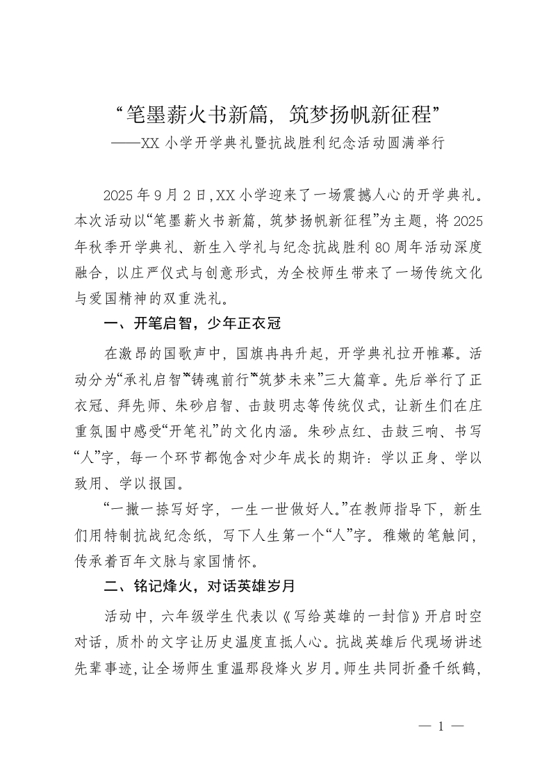 “笔墨薪火书新篇,筑梦扬帆新征程”一X小学开学典礼暨抗战胜利纪念活动圆满举行2025年9月2日,XX小学迎来了一场震撼人心的开学典礼。本次活动以“笔墨薪火书新篇,筑梦扬帆新征程”为主题,将2025年秋季开学典礼、新生入学礼与纪念抗战胜利80周年活动深度融合,以庄严仪式与创意形式,为全校师生带来了一场传统文化与爱国精神的双重洗礼。一、开笔启智,少年正衣冠在激昂的国歌声中,国旗冉冉升起,开学典礼拉开帷幕。活动分为“承礼启智“铸魂前行筑梦未来”三大篇章。先后举行了正衣冠、拜先师、朱砂启智、击鼓明志等传统仪式,让新生们在庄重氛围中感受“开笔礼”的文化内涵。朱砂点红、击鼓三响、书写“人”字,每一个环节都饱含对少年成长的期许:学以正身、学以致用、学以报国。“一撇一捺写好字,一生一世做好人。”在教师指导下,新生们用特制抗战纪念纸,写下人生第一个“人”字。稚嫩的笔触间,传承着百年文脉与家国情怀。二、铭记烽火,对话英雄岁月活动中,六年级学生代表以《写给英雄的一封信》开启时空对话,质朴的文字让历史温度直抵人心。抗战英雄后代现场讲述先辈事迹,让全场师生重温那段烽火岁月。师生共同折叠千纸鹤,