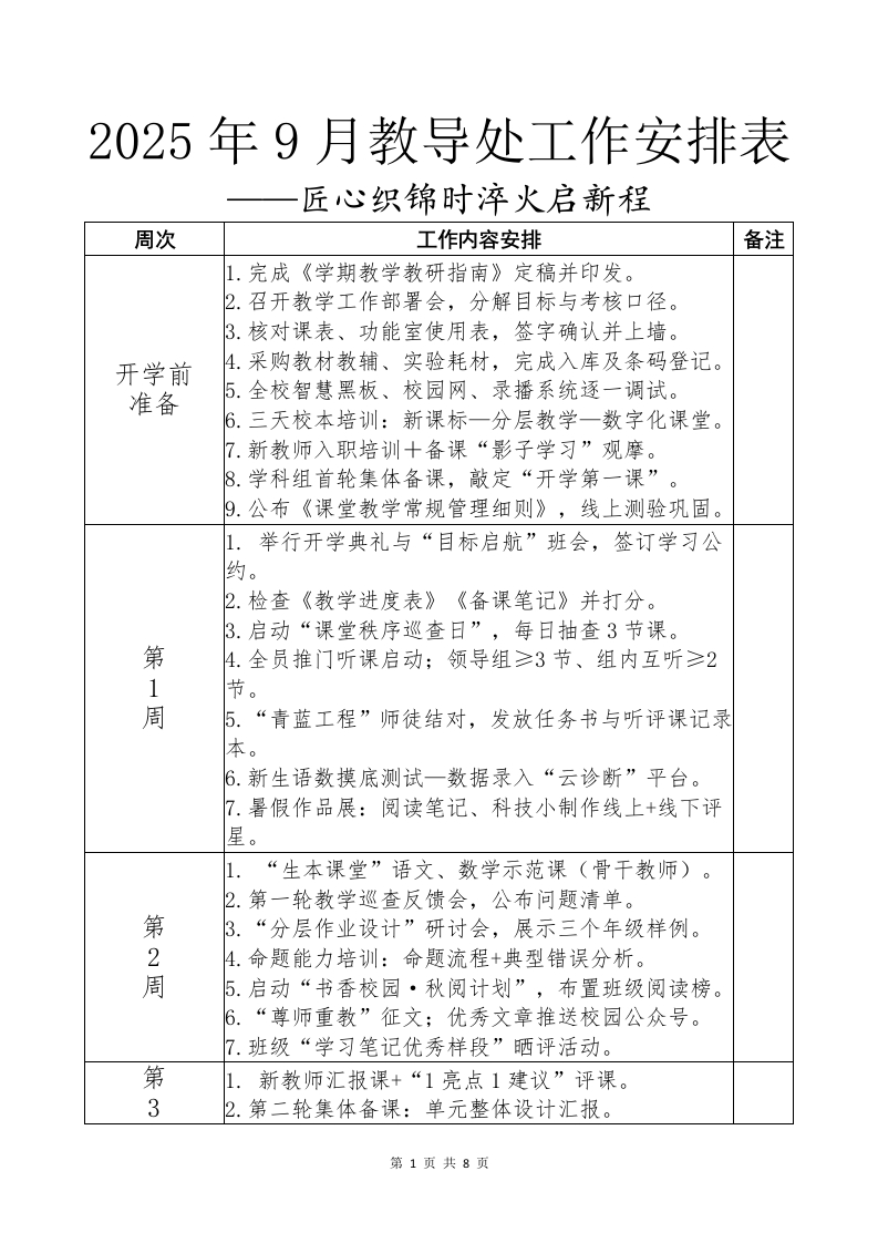 2025年9月教导处工作安排表匠心织锦时淬火启新程周次工作内容安排备注1.完成《学期教学教研指南》定稿并印发。2.召开教学工作部署会,分解目标与考核口径。3.核对课表、功能室使用表,签字确认并上墙。开学前4.采购教材教辅、实验耗材,完成入库及条码登记。准备5.全校智慧黑板、校园网、录播系统逐一调试。6.三天校本培训:新课标一分层教学一数字化课堂。7.新教师入职培训十备课“影子学习”观摩。8.学科组首轮集体备课,敲定“开学第一课”。9.公布《课堂教学常规管理细则》,线上测验巩固。1.举行开学典礼与“目标启航”班会,签订学习公约。2.检查《教学进度表》《备课笔记》并打分。3.启动“课堂秩序巡查日”,每日抽查3节课。第4.全员推门听课启动;领导组≥3节、组内互听≥2节。周5.“青蓝工程”师徒结对,发放任务书与听评课记录本。6.新生语数摸底测试一数据录入“云诊断”平台。7.暑假作品展:阅读笔记、科技小制作线上+线下评星。1.“生本课堂”语文、数学示范课(骨干教师)。2.第一轮教学巡查反馈会,公布问题清单。第3.“分层作业设计”研讨会,展示三个年级样例。2周4.命题能力培训:命题流程+典型错误分析。5.启动“书香校园·秋阅计划”,布置班级阅读榜。6.“尊师重教”征文;优秀文章推送校园公众号。7.班级“学习笔记优秀样段”晒评活动。第1.新教师汇报课+“1亮点1建议”评课。32.第二轮集体备课:单元整体设计汇报。第1页共8页