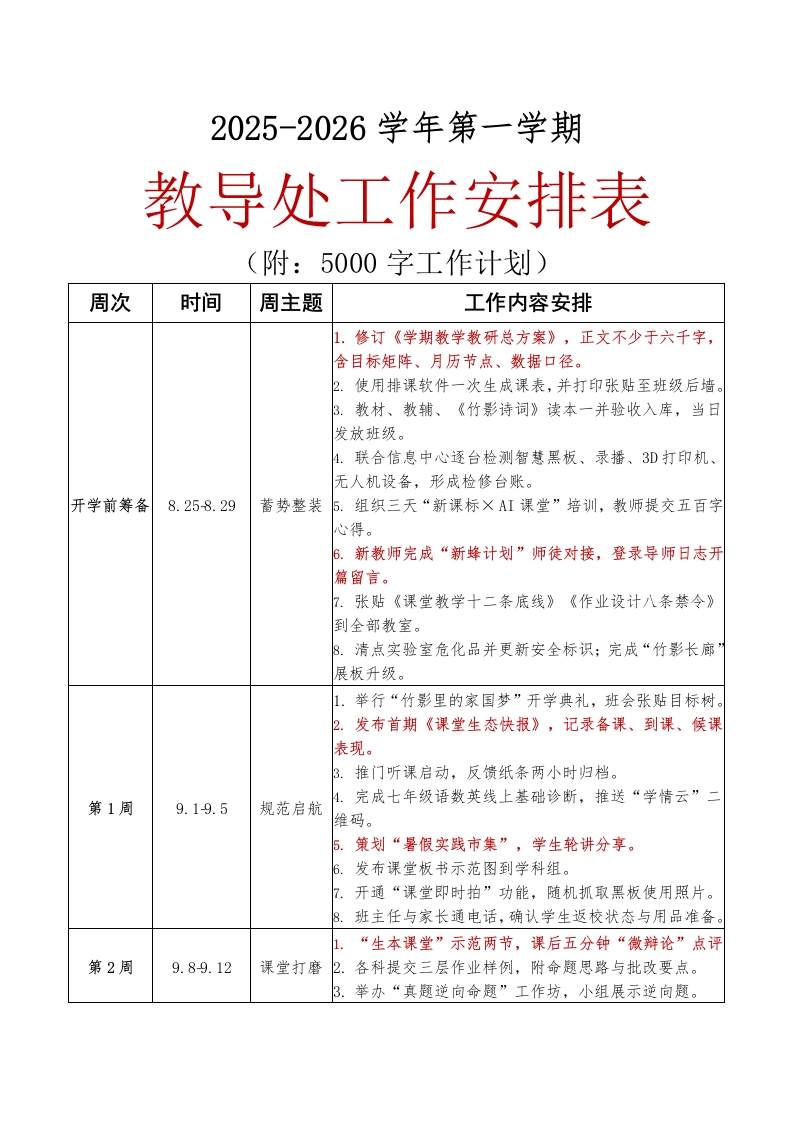2025-2026学年第一学期教导处工作安排表(附:5000字工作计划)周次时间周主题工作内容安排1.修订《学期教学教研总方案》,正文不少于六千字,含目标矩阵、月历节点、数据口径。2.使用排课软件一次生成课表,并打印张贴至班级后墙。3.教材、教辅、《竹影诗词》读本一并验收入库,当日发放班级。4.联合信息中心逐台检测智慧黑板、录播、3D打印机、无人机设备,形成检修台账。开学前筹备8.258.29.组织三天“新课标×AI课堂”培训,教师提交五百字心得。6。新教师完成“新蜂计划”师徒对接,登录导师日志开篇留言。7.张贴《课堂教学十二条底线》《作业设计八条禁令》到全部教室。8.清点实验室危化品并更新安全标识:完成“竹影长廊展板升级。1.举行“竹影里的家国梦”开学典礼,班会张贴目标树。2.发布首期《课堂生态快报》,记录备课、到课、候课表现。3.推门听课启动,反馈纸条两小时归档。完成七年级语数英线上基础诊断,推送“学情云”二第1周9.19.5规范启航维码。5.策划“暑假实践市集”,学生轮讲分享。6发布课堂板书示范图到学科组。开通“课堂即时拍”功能,随机抓取黑板使用照片。8.班主任与家长通电话,确认学生返校状态与用品准备。“生本课堂”示范两节,课后五分钟“微辩论”点评第2周9.89.12课堂打磨各科提交三层作业样例,附命题思路与批改要点。举办“真题逆向命题”工作坊,小组展示逆向题。
