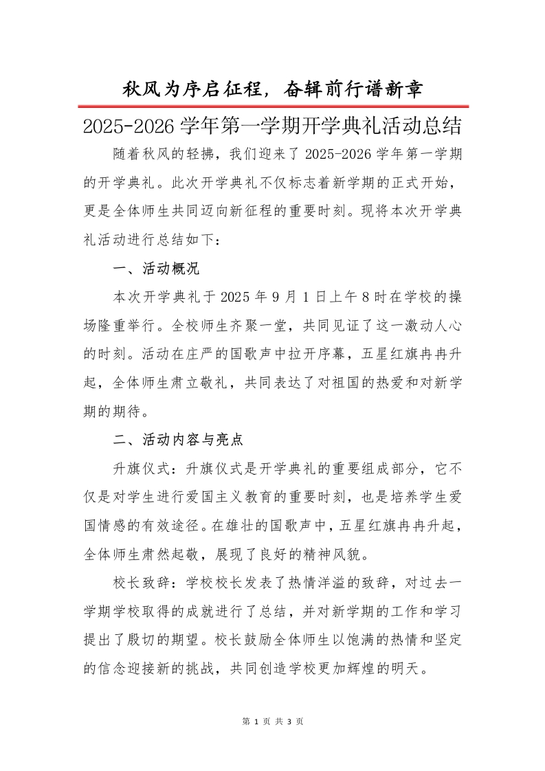 秋风为序启征程,奋辑前行谱新章2025-2026学年第一学期开学典礼活动总结随着秋风的轻拂,我们迎来了2025-2026学年第一学期的开学典礼。此次开学典礼不仅标志着新学期的正式开始,更是全体师生共同迈向新征程的重要时刻。现将本次开学典礼活动进行总结如下:一、活动概况本次开学典礼于2025年9月1日上午8时在学校的操场隆重举行。全校师生齐聚一堂,共同见证了这一激动人心的时刻。活动在庄严的国歌声中拉开序幕,五星红旗冉冉升起,全体师生肃立敬礼,共同表达了对祖国的热爱和对新学期的期待。二、活动内容与亮点升旗仪式:升旗仪式是开学典礼的重要组成部分,它不仅是对学生进行爱国主义教育的重要时刻,也是培养学生爱国情感的有效途径。在雄壮的国歌声中,五星红旗冉冉升起,全体师生肃然起敬,展现了良好的精神风貌。校长致辞:学校校长发表了热情洋溢的致辞,对过去一学期学校取得的成就进行了总结,并对新学期的工作和学习提出了殷切的期望。校长鼓励全体师生以饱满的热情和坚定的信念迎接新的挑战,共同创造学校更加辉煌的明天。第1页共3页