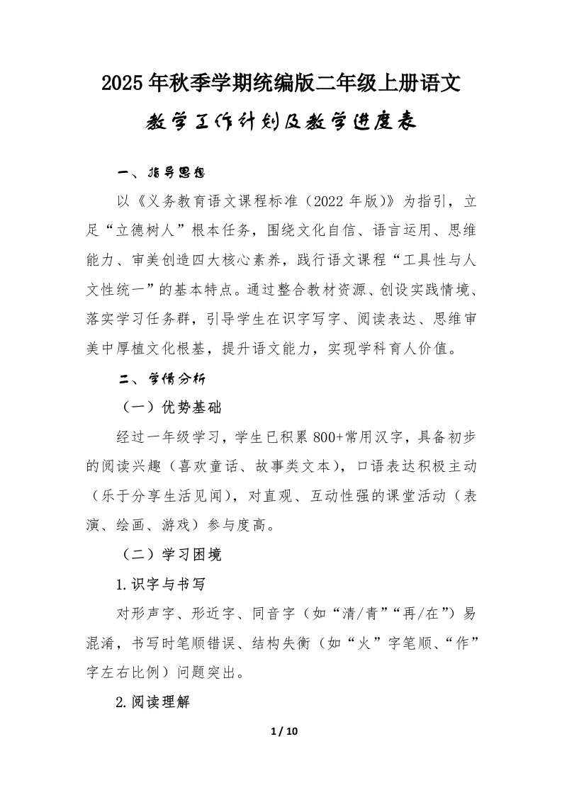 2025年秋季学期统编版二年级上册语文一、指导思想以《义务教育语文课程标准(2022年版)》为指引,立足“立德树人”根本任务,围绕文化自信、语言运用、思维能力、审美创造四大核心素养,践行语文课程“工具性与人文性统一”的基本特点。通过整合教材资源、创设实践情境、落实学习任务群,引导学生在识字写字、阅读表达、思维审美中厚植文化根基,提升语文能力,实现学科育人价值。(一)优势基础经过一年级学习,学生已积累800+常用汉字,具备初步的阅读兴趣(喜欢童话、故事类文本),口语表达积极主动(乐于分享生活见闻),对直观、互动性强的课堂活动(表演、绘画、游戏)参与度高。(二)学习困境1.识字与书写对形声字、形近字、同音字(如“清/青”“再/在”)易混淆,书写时笔顺错误、结构失衡(如“火”字笔顺、“作”字左右比例)问题突出。2.阅读理解1/10