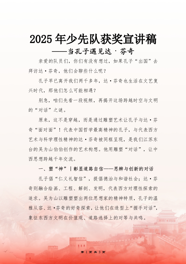 2025年少先队获奖宣讲稿一当孔子遇见达·芬奇亲爱的队员们,你们有没有想过,如果孔子“出国”去拜访达·芬奇,他们会聊些什么呢?孔子早已离开我们两千多年,达·芬奇也生活在文艺复兴时代,那他们怎么可能相遇?别急,咱们先看一段视频,再揭开这场跨越时空与文明的“对话”之谜。原来,这不是穿越,而是通过雕塑艺术让孔子与达·芬奇“面对面”!代表中国哲学最高精神的孔子,与代表西方艺术与科学理性精神的达·芬奇被同框呈现,是我们江苏东台的吴为山伯伯创作的艺术构想。他用雕塑“对话”,让中西思想跨越千年交流。一、塑“神”丨彰显道路自信一一思辨与创新的对话孔子倡“仁义礼智信”,提倡德治与和谐社会;达·芬奇则融合绘画、工程、解剖、发明,代表西方对理性探索的追求。吴为山以雕塑塑出两位思想家的精神特质,孔子的温雅从容、达·芬奇的好奇探索,让他们在造型上“握手对话”,象征东西方文明在价值观、道路选择上的对等与共鸣。第1页共3页