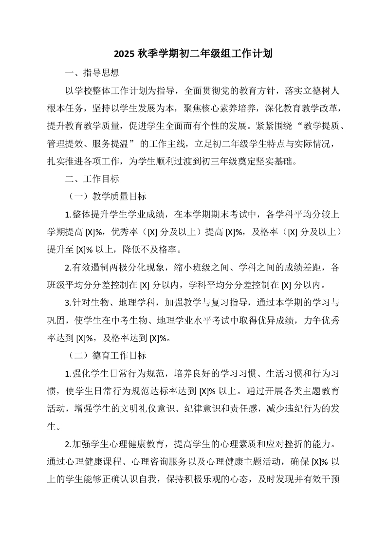 2025秋季学期初二年级组工作计划一、指导思想以学校整体工作计划为指导,全面贯彻党的教育方针,落实立德树人根本任务,坚持以学生发展为本,聚焦核心素养培养,深化教育教学改革,提升教育教学质量,促进学生全面而有个性的发展。紧紧围绕“教学提质、管理提效、服务提温”的工作主线,立足初二年级学生特点与实际情况,扎实推进各项工作,为学生顺利过渡到初三年级奠定坚实基础。二、工作目标(一)教学质量目标1整体提升学生学业成绩,在本学期期末考试中,各学科平均分较上学期提高[X]%,优秀率([X]分及以上)提高[X]%,及格率([X]分及以上)提升至[X]%以上,降低不及格率。2.有效遏制两极分化现象,缩小班级之间、学科之间的成绩差距,各班级平均分分差控制在]分以内,学科平均分分差控制在]分以内。3.针对生物、地理学科,加强教学与复习指导,通过本学期的学习与巩固,使学生在中考生物、地理学业水平考试中取得优异成绩,力争优秀率达到[X]%,及格率达到[X]%。(二)德育工作目标1.强化学生日常行为规范,培养良好的学习习惯、生活习惯和行为习惯,使学生日常行为规范达标率达到X]%以上。通过开展各类主题教育活动,增强学生的文明礼仪意识、纪律意识和责任感,减少违纪行为的发生。2.加强学生心理健康教育,提高学生的心理素质和应对挫折的能力。通过心理健康课程、心理咨询服务以及心理健康主题活动,确保X]%以上的学生能够正确认识自我,保持积极乐观的心态,及时发现并有效干预