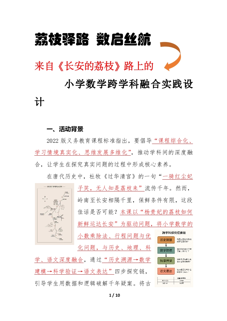 荔枝驿路数启丝航来自《长安的荔枝》路上的小学数学跨学科融合实践设计一、活动背景2022版义务教育课程标准指出,要倡导“课程综合化、学习情境真实化、思维发展多维化”,推动学科间的深度融合,让学生在探究真实问题的过程中形成核心素养。在唐代历史中,杜牧《过华清宫》的一句“一骑红尘妃子笑,无人知是荔枝来”流传千年。然而,岭南至长安相隔千里,保鲜条件有限,这段佳话是否可能?本课以“杨贵妃的荔枝如何新鲜运达长安”为驱动问题,将小学数学的小数乘除法、行程问题与优化问题,与历史、地理、科学、语文深度融合,通过“历史溯源→数学科学检证建模一科学验证一语文表达”四步探究链,语文表达引导学生用数据和逻辑破解千年疑案。将古1/10