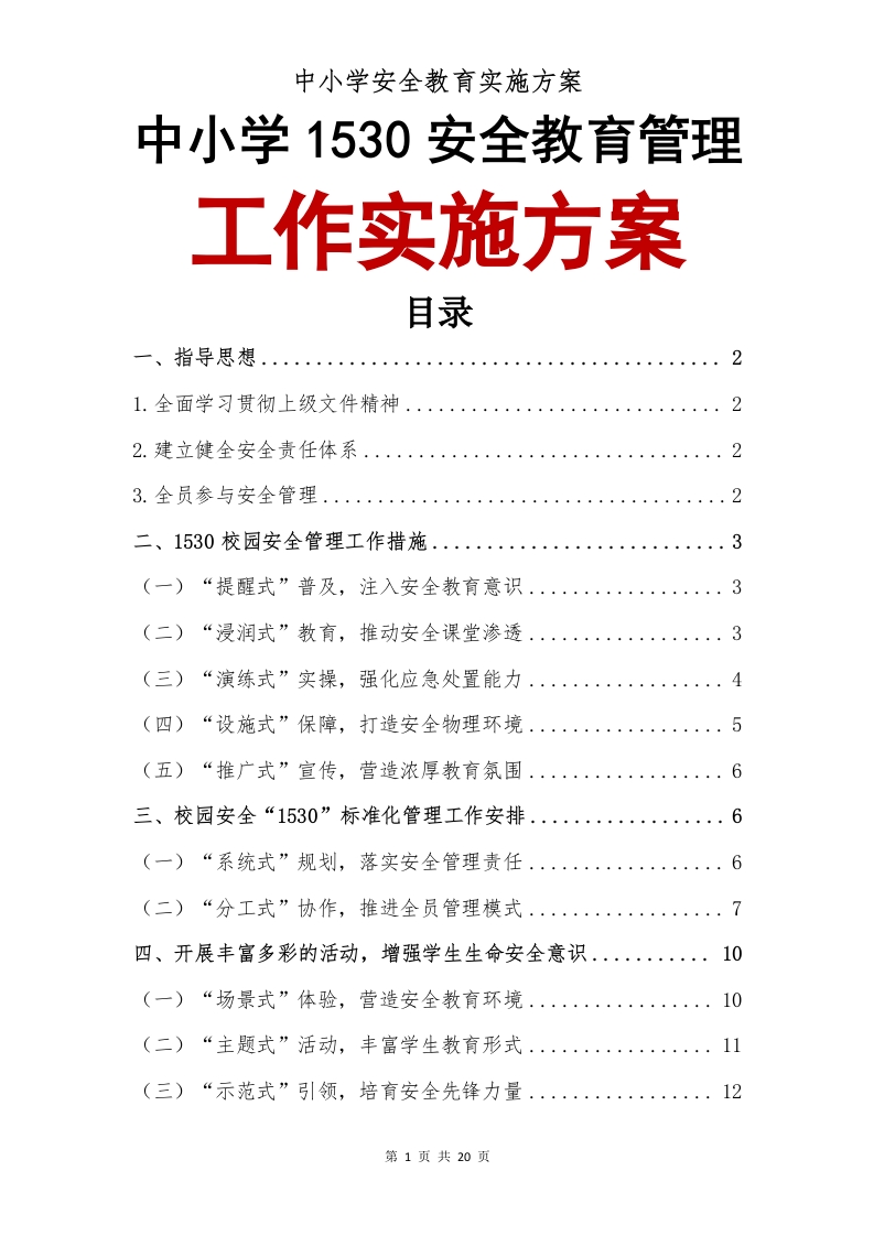 中小学安全教育实施方案中小学1530安全教育管理工作实施方案目录一、指导思想.21.全面学习贯彻上级文件精神..2.建立健全安全责任体系...23.全员参与安全管理...二、1530校园安全管理工作措施...3(一)“提醒式”普及,注入安全教育意识·3(二)“浸润式”教育,推动安全课堂渗透.·3(三)“演练式”实操,强化应急处置能力.·4(四)“设施式”保障,打造安全物理环境..5(五)“推广式”宣传,营造浓厚教育氛围..6(一)“系统式”规划,落实安全管理责任.·6(二)“分工式”协作,推进全员管理模式.…7四、开展丰富多彩的活动,增强学生生命安全意识.·10(一)“场景式”体验,营造安全教育环境..10(二)“主题式”活动,丰富学生教育形式·11(三)“示范式”引领,培育安全先锋力量.·12第1页共20页
