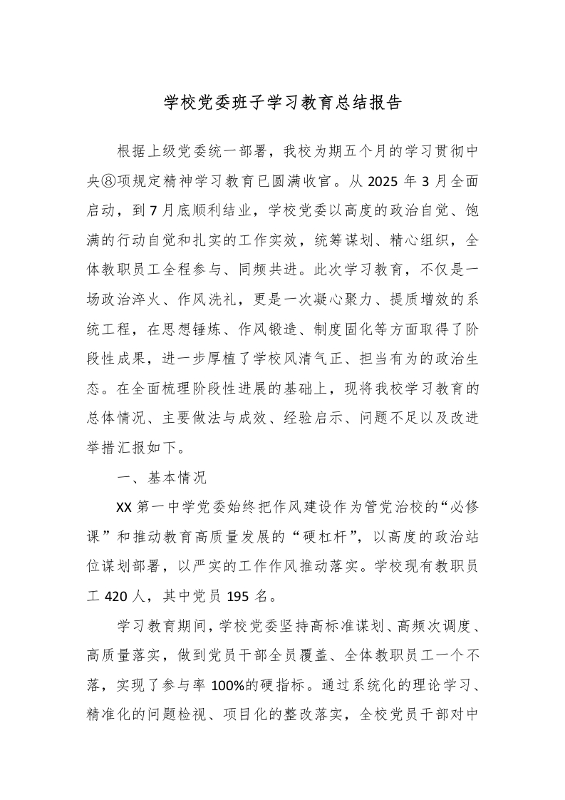 学校党委班子学习教育总结报告根据上级党委统一部署,我校为期五个月的学习贯彻中央⑧项规定精神学习教育已圆满收官。从2025年3月全面启动,到7月底顺利结业,学校党委以高度的政治自觉、饱满的行动自觉和扎实的工作实效,统筹谋划、精心组织,全体教职员工全程参与、同频共进。此次学习教育,不仅是一场政治淬火、作风洗礼,更是一次凝心聚力、提质增效的系统工程,在思想锤炼、作风锻造、制度固化等方面取得了阶段性成果,进一步厚植了学校风清气正、担当有为的政治生态。在全面梳理阶段性进展的基础上,现将我校学习教育的总体情况、主要做法与成效、经验启示、问题不足以及改进举措汇报如下。一、基本情况X第一中学党委始终把作风建设作为管党治校的“必修课”和推动教育高质量发展的“硬杠杆”,以高度的政治站位谋划部署,以严实的工作作风推动落实。学校现有教职员工420人,其中党员195名。学习教育期间,学校党委坚持高标准谋划、高频次调度、高质量落实,做到党员干部全员覆盖、全体教职员工一个不落,实现了参与率100%的硬指标。通过系统化的理论学习、精准化的问题检视、项目化的整改落实,全校党员干部对中