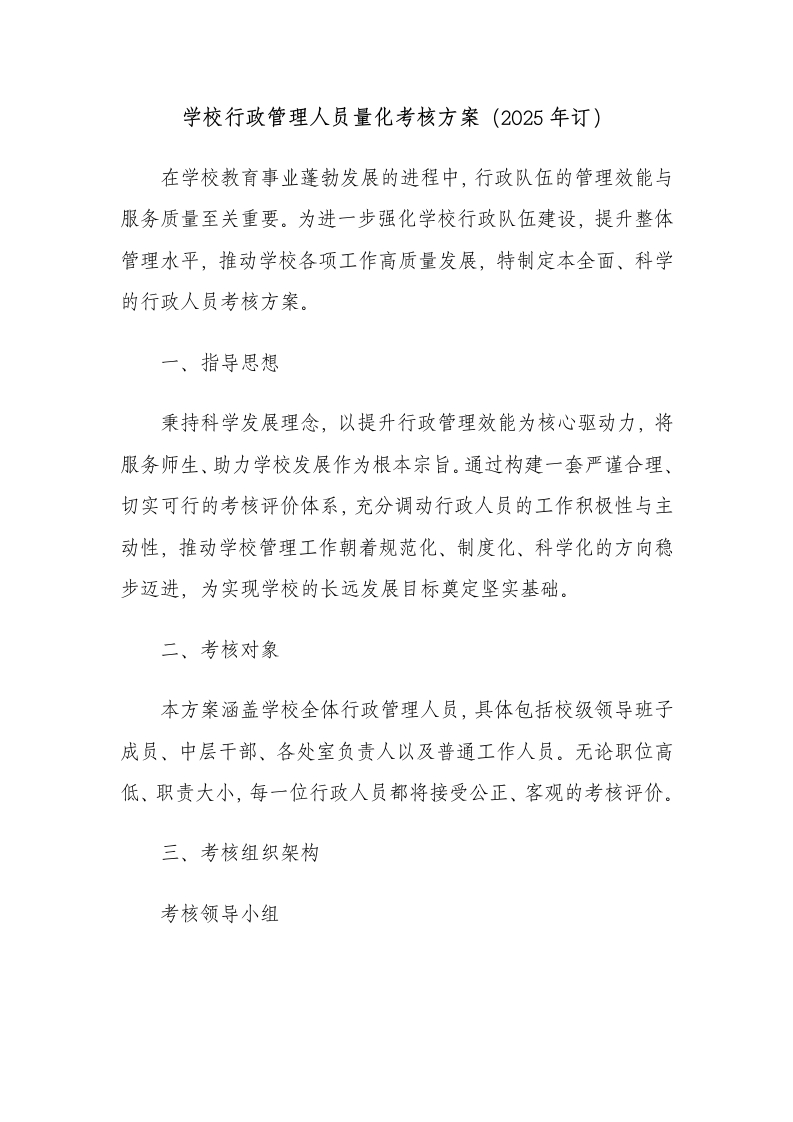 学校行政管理人员量化考核方案(2025年订)在学校教育事业蓬勃发展的进程中,行政队伍的管理效能与服务质量至关重要。为进一步强化学校行政队伍建设,提升整体管理水平,推动学校各项工作高质量发展,特制定本全面、科学的行政人员考核方案。一、指导思想秉持科学发展理念,以提升行政管理效能为核心驱动力,将服务师生、助力学校发展作为根本宗旨。通过构建一套严谨合理、切实可行的考核评价体系,充分调动行政人员的工作积极性与主动性,推动学校管理工作朝着规范化、制度化、科学化的方向稳步迈进,为实现学校的长远发展目标奠定坚实基础。二、考核对象本方案涵盖学校全体行政管理人员,具体包括校级领导班子成员、中层干部、各处室负责人以及普通工作人员。无论职位高低、职责大小,每一位行政人员都将接受公正、客观的考核评价。三、考核组织架构考核领导小组