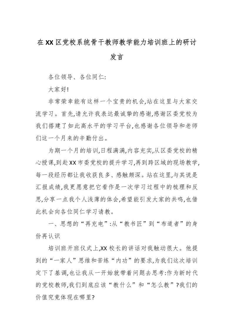 在X区党校系统骨干教师教学能力培训班上的研讨发言各位领导、各位同仁:大家好!非常荣幸能有这样一个宝贵的机会,站在这里与大家交流学习。首先,请允许我表达最诚挚的感谢,感谢区委党校为我们搭建了如此高水平的学习平台,也感谢各位领导和老师们这一个月来的辛勤付出。为期一个月的培训,日程满满,内容充实,从区委党校的精心授课,到赴X市委党校的提升学习,再到跨区域的现场教学,每一段经历都让我收获良多、感触颇深。站在这里,与其说是汇报成绩,我更愿意把它看作是一次学习过程中的梳理和反思,分享一点我个人浅薄的体会,希望能引发大家的共鸣,也借此机会向各位同仁学习请教。一、思想的“再充电”:从“教书匠”到“布道者”的身份再认识培训班开班仪式上,XX校长的讲话对我触动很大。他提到的“一家人”思维和苦练“内功”的要求,为我们这次培训定下了基调,也让我从一开始就带着问题去思考:作为新时代的党校教师,我们到底应该“教什么”和“怎么教”?我们的价值究竟体现在哪里?