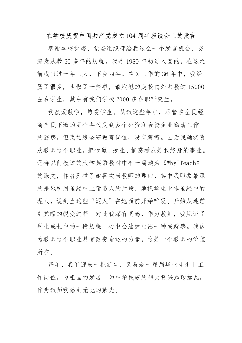 在学校庆祝中国共产党成立104周年座谈会上的发言感谢学校党委、党委组织部给我这么一个发言机会,交流我从教30多年的历程。我是1980年初进入X的,在这之前我当过一年工人,下乡四年。在X工作的36年中,我经历了很多,也做了一些事,最欣慰的是校内外共教过15000左右学生,其中有我们学校2000多在职研究生。我热爱教学,热爱学生。从教这些年中,尽管在全民经商全民下海的那个年代受到多个外资和合资企业高薪工作的诱惑,但我始终坚守教育岗位,没有跳槽。因为我确实喜欢教师这个职业,把传道、授业、解惑看成是我终身的事业。记得以前教过的大学英语教材中有一篇题为《WhyITeach》的课文,作者列举了她喜欢当教师的理由,其中我印象最深的是她引用圣经中上帝造人的片段,她把学生比作圣经中的泥人,说到当这些“泥人”在她面前开始呼吸、开始从迷茫到觉醒的蜕变过程。对此我深有同感,作为教师,我见证了学生成长中的一段历程,心中会油然生出一种成就感。我认为教师这个职业具有改变命运的力量,这是一个教师的价值所在。每年,我们迎来一批新生,又看着一届届毕业生走上工作岗位,为祖国的发展,为中华民族的伟大复兴添砖加瓦,作为教师我感到无比的荣光。