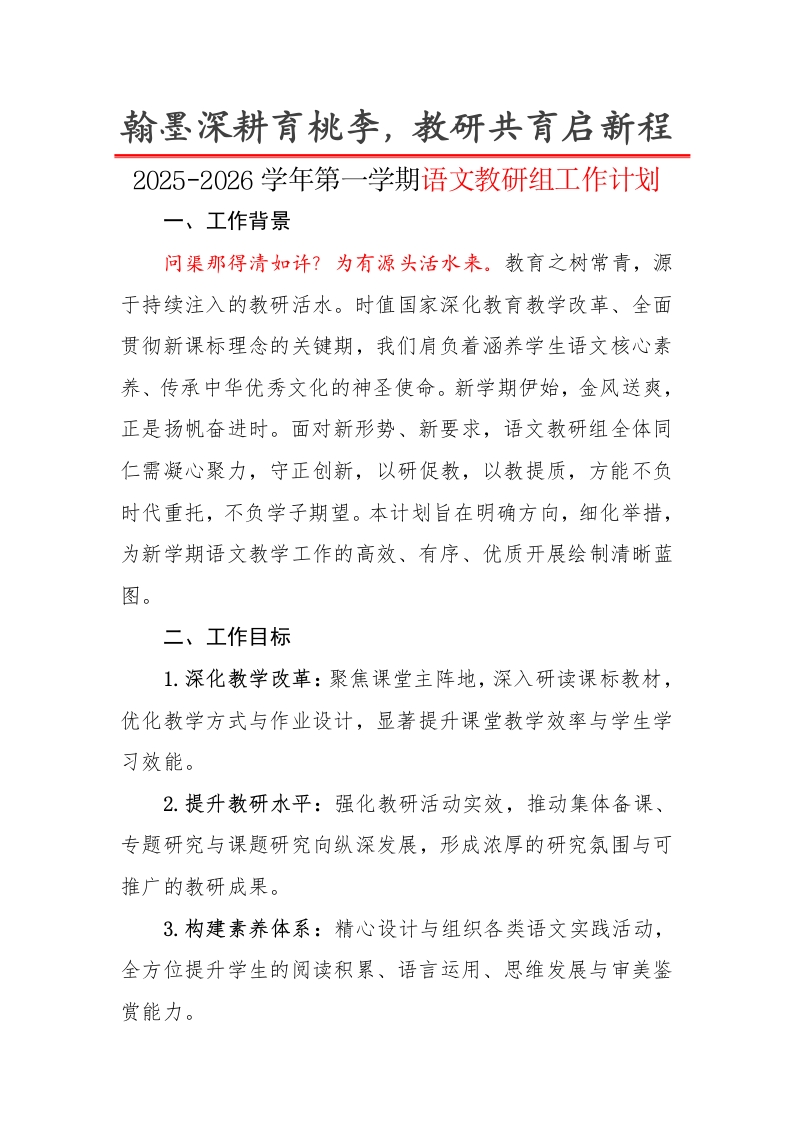 翰墨深耕育桃李,教研共育启新程2025-2026学年第一学期语文教研组工作计划ー、工作背景问渠那得清如许?为有源头活水来。教育之树常青,源于持续注入的教研活水。时值国家深化教育教学改革、全面贯彻新课标理念的关键期,我们肩负着涵养学生语文核心素养、传承中华优秀文化的神圣使命。新学期伊始,金风送爽,正是扬帆奋进时。面对新形势、新要求,语文教研组全体同仁需凝心聚力,守正创新,以研促教,以教提质,方能不负时代重托,不负学子期望。本计划旨在明确方向,细化举措,为新学期语文教学工作的高效、有序、优质开展绘制清晰蓝图。二、工作目标1.深化教学改革:聚焦课堂主阵地,深入研读课标教材,优化教学方式与作业设计,显著提升课堂教学效率与学生学习效能。2.提升教研水平:强化教研活动实效,推动集体备课、专题研究与课题研究向纵深发展,形成浓厚的研究氛围与可推广的教研成果。3.构建素养体系:精心设计与组织各类语文实践活动,全方位提升学生的阅读积累、语言运用、思维发展与审美鉴赏能力。