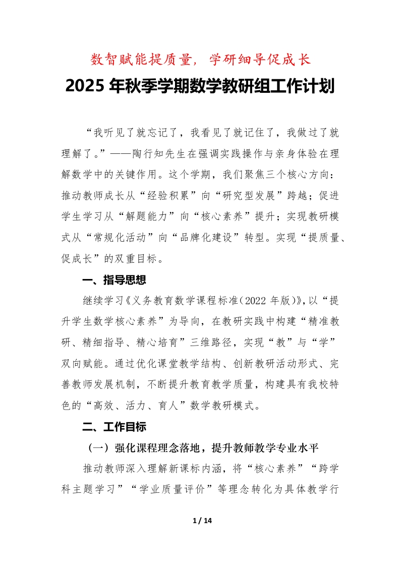 数智赋能提质量,学研细导促成长2025年秋季学期数学教研组工作计划“我听见了就忘记了,我看见了就记住了,我做过了就理解了。”一一陶行知先生在强调实践操作与亲身体验在理解数学中的关键作用。这个学期,我们聚焦三个核心方向:推动教师成长从“经验积累”向“研究型发展”跨越;促进学生学习从“解题能力”向“核心素养”提升;实现教研模式从“常规化活动”向“品牌化建设”转型。实现“提质量、促成长”的双重目标。一、指导思想继续学习《义务教育数学课程标准(2022年版)》,以“提升学生数学核心素养”为导向,在教研实践中构建“精准教研、精细指导、精心培育”三维路径,实现“教”与“学”双向赋能。通过优化课堂教学结构、创新教研活动形式、完善教师发展机制,不断提升教育教学质量,构建具有我校特色的“高效、活力、育人”数学教研模式。二、工作目标(一)强化课程理念落地,提升教师教学专业水平推动教师深入理解新课标内涵,将“核心素养”“跨学科主题学习”“学业质量评价”等理念转化为具体教学行1/14