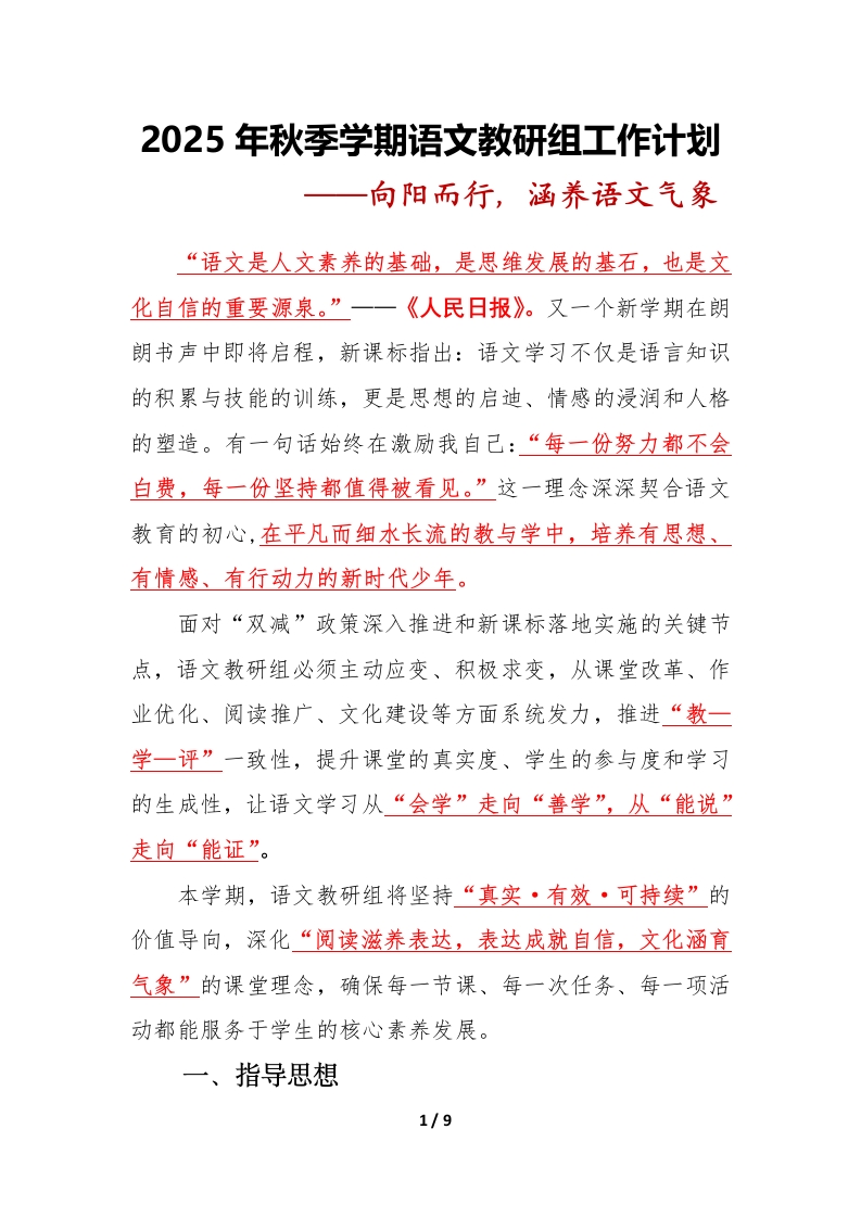 2025年秋季学期语文教研组工作计划—向阳而行,涵养语文气象“语文是人文素养的基础,是思维发展的基石,也是文化自信的重要源泉。”一一《人民日报》。又一个新学期在朗朗书声中即将启程,新课标指出:语文学习不仅是语言知识的积累与技能的训练,更是思想的启迪、情感的浸润和人格的塑造。有一句话始终在激励我自己:“每一份努力都不会白费,每一份坚持都值得被看见。”这一理念深深契合语文教育的初心,在平凡而细水长流的教与学中,培养有思想、有情感、有行动力的新时代少年。面对“双减”政策深入推进和新课标落地实施的关键节点,语文教研组必须主动应变、积极求变,从课堂改革、作业优化、阅读推广、文化建设等方面系统发力,推进“教二学一评”一致性,提升课堂的真实度、学生的参与度和学习的生成性,让语文学习从“会学”走向“善学”,从“能说”走向“能证”。本学期,语文教研组将坚持“真实·有效·可持续”的价值导向,深化“阅读滋养表达,表达成就自信,文化涵育气象”的课堂理念,确保每一节课、每一次任务、每一项活动都能服务于学生的核心素养发展。一、指导思想1/9
