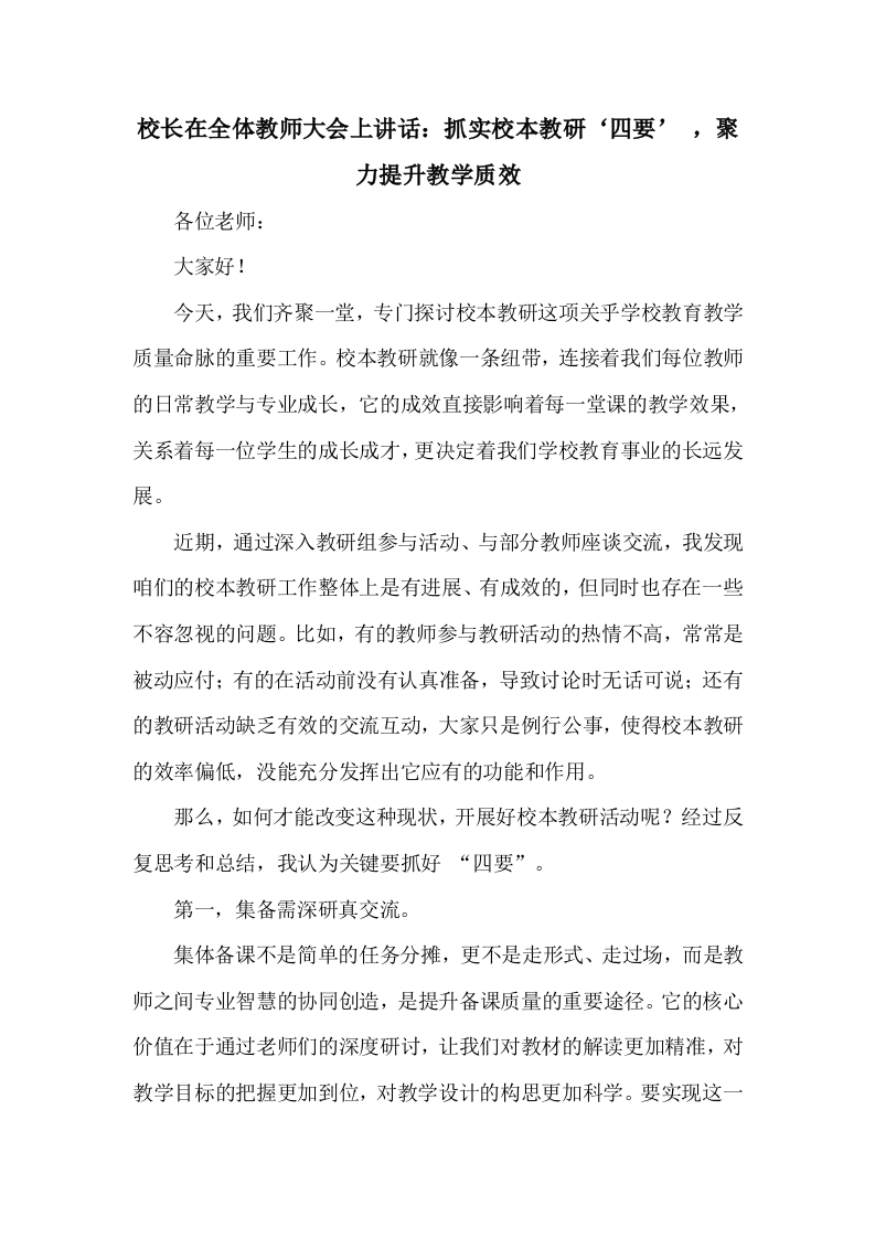 校长在全体教师大会上讲话:抓实校本教研‘四要’,聚力提升教学质效各位老师:大家好!今天,我们齐聚一堂,专门探讨校本教研这项关乎学校教育教学质量命脉的重要工作。校本教研就像一条纽带,连接着我们每位教师的日常教学与专业成长,它的成效直接影响着每一堂课的教学效果,关系着每一位学生的成长成才,更决定着我们学校教育事业的长远发展。近期,通过深入教研组参与活动、与部分教师座谈交流,我发现咱们的校本教研工作整体上是有进展、有成效的,但同时也存在一些不容忽视的问题。比如,有的教师参与教研活动的热情不高,常常是被动应付:有的在活动前没有认真准备,导致讨论时无话可说:还有的教研活动缺乏有效的交流互动,大家只是例行公事,使得校本教研的效率偏低,没能充分发挥出它应有的功能和作用。那么,如何才能改变这种现状,开展好校本教研活动呢?经过反复思考和总结,我认为关键要抓好“四要”。第一,集备需深研真交流。集体备课不是简单的任务分摊,更不是走形式、走过场,而是教师之间专业智慧的协同创造,是提升备课质量的重要途径。它的核心价值在于通过老师们的深度研讨,让我们对教材的解读更加精准,对教学目标的把握更加到位,对教学设计的构思更加科学。要实现这一