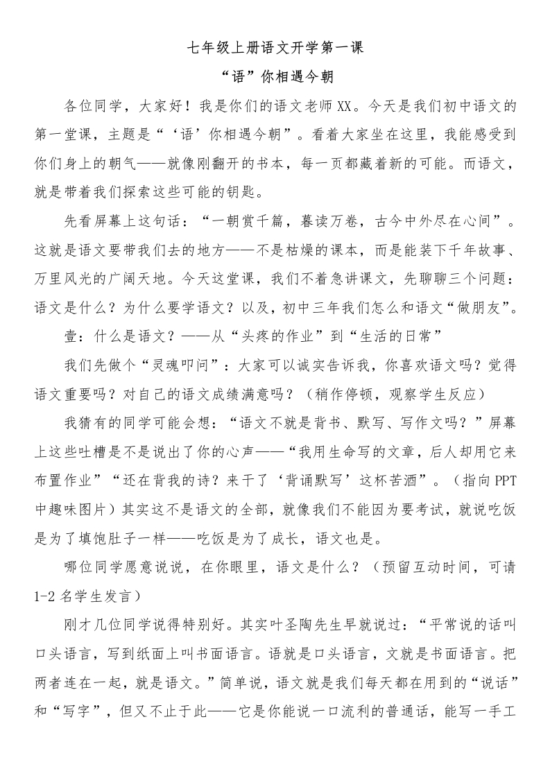七年级上册语文开学第一课“语”你相遇今朝各位同学,大家好!我是你们的语文老师XX。今天是我们初中语文的第一堂课,主题是“‘语’你相遇今朝”。看着大家坐在这里,我能感受到你们身上的朝气一一就像刚翻开的书本,每一页都藏着新的可能。而语文,就是带着我们探索这些可能的钥匙。先看屏幕上这句话:“一朝赏千篇,暮读万卷,古今中外尽在心间”。这就是语文要带我们去的地方一一不是枯燥的课本,而是能装下千年故事、万里风光的广阔天地。今天这堂课,我们不着急讲课文,先聊聊三个问题:语文是什么?为什么要学语文?以及,初中三年我们怎么和语文“做朋友”。壹:什么是语文?一一从“头疼的作业”到“生活的日常”我们先做个“灵魂叩问”:大家可以诚实告诉我,你喜欢语文吗?觉得语文重要吗?对自己的语文成绩满意吗?(稍作停顿,观察学生反应)我猜有的同学可能会想:“语文不就是背书、默写、写作文吗?”屏幕上这些吐槽是不是说出了你的心声一一“我用生命写的文章,后人却用它来布置作业”“还在背我的诗?来干了‘背诵默写’这杯苦酒”。(指向PPT中趣味图片)其实这不是语文的全部,就像我们不能因为要考试,就说吃饭是为了填饱肚子一样一一吃饭是为了成长,语文也是。哪位同学愿意说说,在你眼里,语文是什么?(预留互动时间,可请1-2名学生发言)刚才几位同学说得特别好。其实叶圣陶先生早就说过:“平常说的话叫口头语言,写到纸面上叫书面语言。语就是口头语言,文就是书面语言。把两者连在一起,就是语文。”简单说,语文就是我们每天都在用到的“说话”和“写字”,但又不止于此一一它是你能说一口流利的普通话,能写一手工