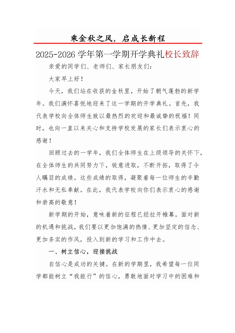 乘金秋之风,启成长新程2025-2026学年第一学期开学典礼校长致辞亲爱的同学们、老师们、家长朋友们:大家早上好!今天,我们站在收获的金秋里,开始了朝气蓬勃的新学年。我们满怀喜悦地迎来了这一学期的开学典礼。首先,我代表学校向全体师生致以最热烈的欢迎和最诚挚的祝福!同时,也向一直以来关心和支持学校发展的家长们表示衷心的感谢!回顾过去的一学年,我们全体师生在上级领导的关怀下,在全体师生的共同努力下,锐意进取,不断开拓,取得了令人瞩目的成绩。这些成绩的取得,凝聚着每一位师生的辛勤汗水和无私奉献。在此,我代表学校向你们表示衷心的感谢和崇高的敬意!新学期的开始,意味着新的征程已经拉开帷幕。面对新的机遇和挑战,我们要以更加饱满的热情、更加坚定的信念、更加务实的作风,投入到新的学习和工作中去。一、树立信心,迎接挑战自信心是成功的关键。在新的学期里,我希望每一位同学都能树立“我能行”的信心,勇敢地面对学习中的困难和