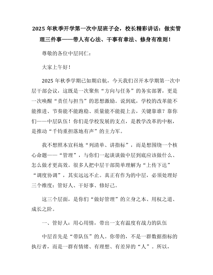 2025年秋季开学第一次中层班子会,校长精彩讲话:做实管理三件事一一带人有心法、干事有章法、修身有准则!尊敬的各位中层同仁:大家上午好!2025年秋季学期已如期启航,今天我们召开本学期第一次中层干部会议,这既是一次聚焦“方向与任务”的务实部署,更是一次唤醒“责任与担当”的思想激励。说到底,学校的改革能不能推进、节奏能不能跑稳、质量能不能提上去,关键靠谁?靠你们一一中层队伍!你们是学校发展的支点,是教学改革的中枢,是推动“千钧重担落地有声”的主力军。我不想照本宣科地“列清单、讲指标”,而是想围绕一个核心命题一一“管理”,与你们一起谈谈做中层到底应该做什么、怎么做才更高效。很多人把中层干部简单理解为“上传下达”“调度协调”,其实远远不止。真正有作为的中层,必须处理好三个维度:管好人、干好事、修好己。这三个层面,是你们“做好管理”的立身之本、用权之道、成长之阶。一、管好人:用心用情,带出一支有温度有战力的队伍中层首先是“带队伍”的人。你带的,不是一群数据指标的执行者,而是一群有情绪、有理想、有差异的“人”。所以,