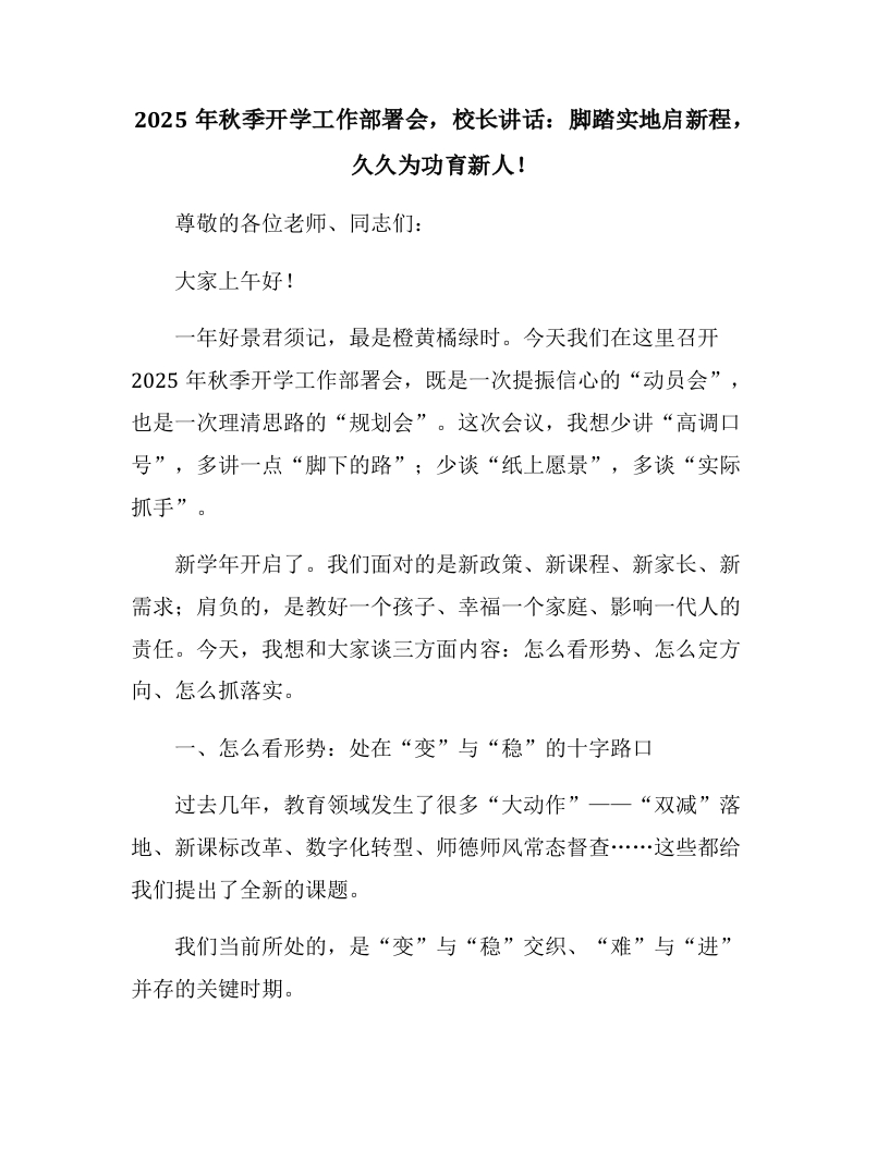 2025年秋季开学工作部署会,校长讲话:脚踏实地启新程,久久为功育新人!尊敬的各位老师、同志们:大家上午好!一年好景君须记,最是橙黄橘绿时。今天我们在这里召开2025年秋季开学工作部署会,既是一次提振信心的“动员会”,也是一次理清思路的“规划会”。这次会议,我想少讲“高调口号”,多讲一点“脚下的路”;少谈“纸上愿景”,多谈“实际抓手”。新学年开启了。我们面对的是新政策、新课程、新家长、新需求:肩负的,是教好一个孩子、幸福一个家庭、影响一代人的责任。今天,我想和大家谈三方面内容:怎么看形势、怎么定方向、怎么抓落实。一、怎么看形势:处在“变”与“稳”的十字路口过去几年,教育领域发生了很多“大动作”一一“双减”落地、新课标改革、数字化转型、师德师风常态督查…这些都给我们提出了全新的课题。我们当前所处的,是“变”与“稳”交织、“难”与“进”并存的关键时期。