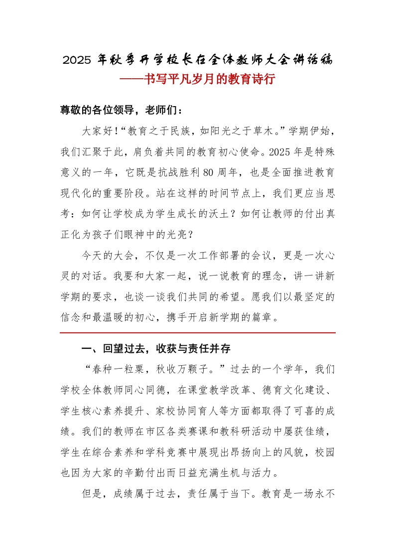 2025年秋季开学校长在全体教师大会琳结稿书写平凡岁月的教育诗行尊敬的各位领导,老师们:大家好!“教育之于民族,如阳光之于草木。”学期伊始,我们汇聚于此,肩负着共同的教育初心使命。2025年是特殊意义的一年,它既是抗战胜利80周年,也是全面推进教育现代化的重要阶段。站在这样的时间节点上,我们更应当思考:如何让学校成为学生成长的沃土?如何让教师的付出真正化为孩子们眼神中的光亮?今天的大会,不仅是一次工作部署的会议,更是一次心灵的对话。我要和大家一起,说一说教育的理念,讲一讲新学期的要求,也谈一谈我们共同的希望。愿我们以最坚定的信念和最温暖的初心,携手开启新学期的篇章。一、回望过去,收获与责任并存“春种一粒粟,秋收万颗子。”过去的一个学年,我们学校全体教师同心同德,在课堂教学改革、德育文化建设、学生核心素养提升、家校协同育人等方面都取得了可喜的成绩。我们的教师在市区各类赛课和教科研活动中屡获佳绩,学生在综合素养和学科竞赛中展现出昂扬向上的风貌,校园也因为大家的辛勤付出而日益充满生机与活力。但是,成绩属于过去,责任属于当下。教育是一场永不