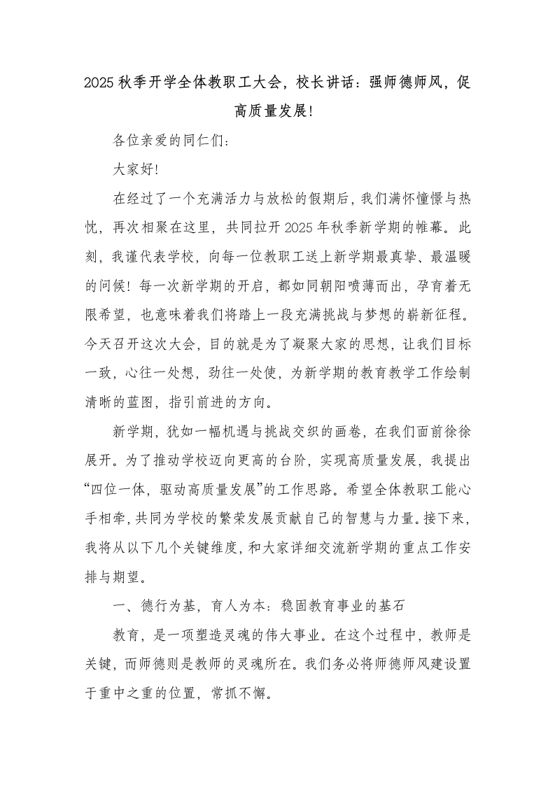 2025秋季开学全体教职工大会,校长讲话:强师德师风,促高质量发展!各位亲爱的同仁们:大家好!在经过了一个充满活力与放松的假期后,我们满怀憧憬与热忱,再次相聚在这里,共同拉开2025年秋季新学期的帷幕。此刻,我谨代表学校,向每一位教职工送上新学期最真挚、最温暖的问候!每一次新学期的开启,都如同朝阳喷薄而出,孕育着无限希望,也意味着我们将踏上一段充满挑战与梦想的崭新征程。今天召开这次大会,目的就是为了凝聚大家的思想,让我们目标一致,心往一处想,劲往一处使,为新学期的教育教学工作绘制清晰的蓝图,指引前进的方向。新学期,犹如一幅机遇与挑战交织的画卷,在我们面前徐徐展开。为了推动学校迈向更高的台阶,实现高质量发展,我提出“四位一体,驱动高质量发展”的工作思路。希望全体教职工能心手相牵,共同为学校的繁荣发展贡献自己的智慧与力量。接下来,我将从以下几个关键维度,和大家详细交流新学期的重点工作安排与期望。一、德行为基,育人为本:稳固教育事业的基石教育,是一项塑造灵魂的伟大事业。在这个过程中,教师是关键,而师德则是教师的灵魂所在。我们务必将师德师风建设置于重中之重的位置,常抓不解。
