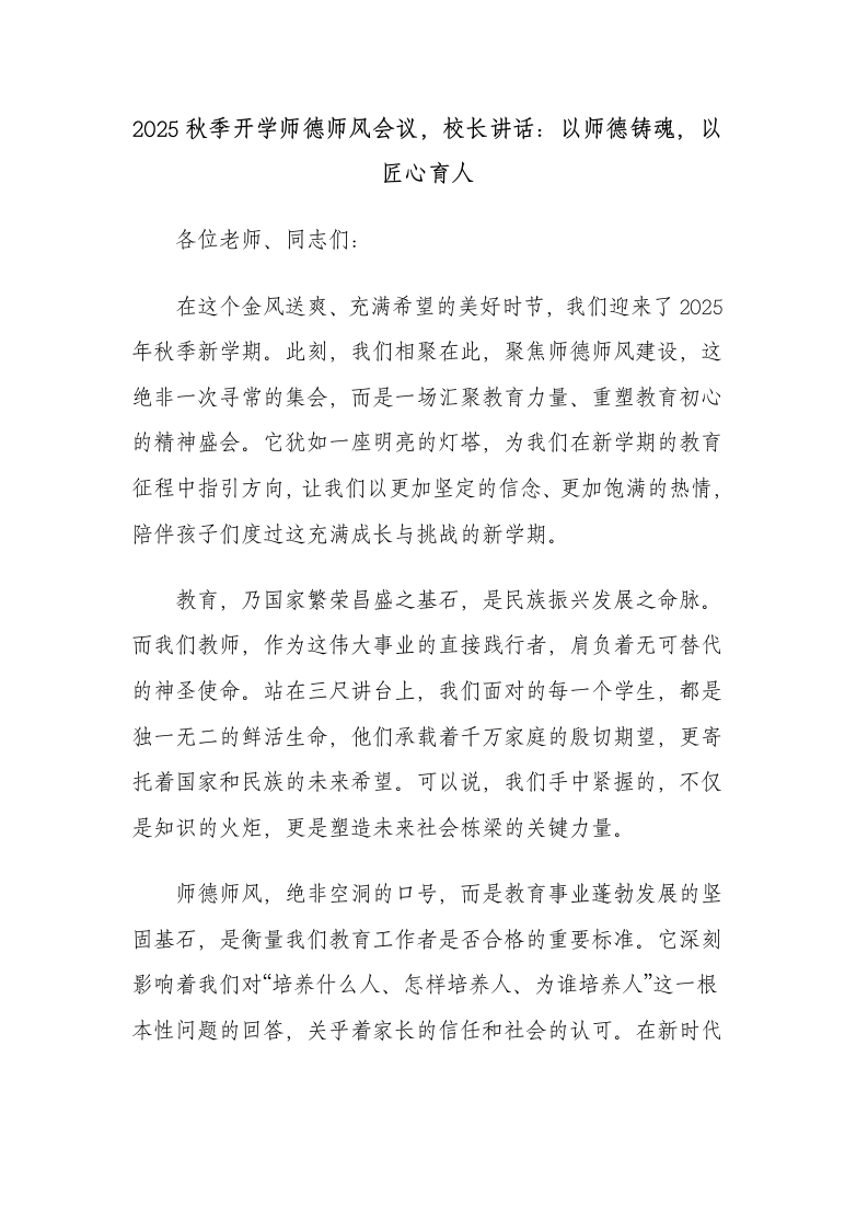 2025秋季开学师德师风会议,校长讲话:以师德铸魂,以匠心育人各位老师、同志们:在这个金风送爽、充满希望的美好时节,我们迎来了2025年秋季新学期。此刻,我们相聚在此,聚焦师德师风建设,这绝非一次寻常的集会,而是一场汇聚教育力量、重塑教育初心的精神盛会。它犹如一座明亮的灯塔,为我们在新学期的教育征程中指引方向,让我们以更加坚定的信念、更加饱满的热情,陪伴孩子们度过这充满成长与挑战的新学期。教育,乃国家繁荣昌盛之基石,是民族振兴发展之命脉。而我们教师,作为这伟大事业的直接践行者,肩负着无可替代的神圣使命。站在三尺讲台上,我们面对的每一个学生,都是独一无二的鲜活生命,他们承载着千万家庭的殷切期望,更寄托着国家和民族的未来希望。可以说,我们手中紧握的,不仅是知识的火炬,更是塑造未来社会栋梁的关键力量。师德师风,绝非空洞的口号,而是教育事业蓬勃发展的坚固基石,是衡量我们教育工作者是否合格的重要标准。它深刻影响着我们对“培养什么人、怎样培养人、为谁培养人”这一根本性问题的回答,关乎着家长的信任和社会的认可。在新时代