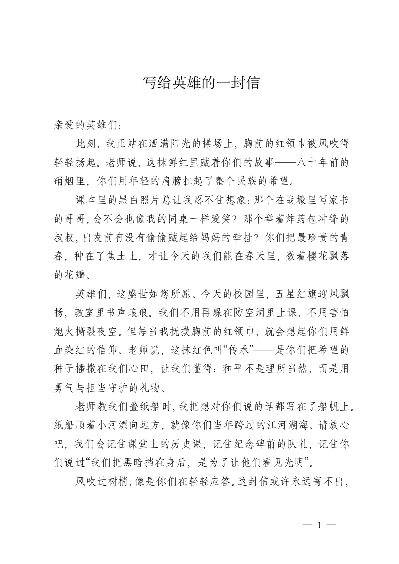 写给英雄的一封信亲爱的英雄们:此刻,我正站在洒满阳光的操场上,胸前的红领巾被风吹得轻轻扬起。老师说,这抹鲜红里藏着你们的故事一八十年前的硝烟里,你们用年轻的肩膀扛起了整个民族的希望。课本里的黑白照片总让我忍不住想象:那个在战壕里写家书的哥哥,会不会也像我的同桌一样爱笑?那个举着炸药包冲锋的叔叔,出发前有没有偷偷藏起给妈妈的牵挂?你们把最珍贵的青春,种在了焦土上,才让今天的我们能在春天里,数着樱花飘落的花瓣。英雄们,这盛世如您所愿。今天的校园里,五星红旗迎风飘扬,教室里书声琅琅。我们不用再躲在防空洞里上课,不用害怕炮火撕裂夜空。但每当我抚摸胸前的红领巾,就会想起你们用鲜血染红的信仰。老师说,这抹红色叫“传承”一是你们把希望的种子播撒在我们心田,让我们懂得:和平不是理所当然,而是用勇气与担当守护的礼物。老师教我们叠纸船时,我把想对你们说的话都写在了船帆上。纸船顺着小河漂向远方,就像你们当年跨过的江河湖海。请放心吧,我们会记住课堂上的历史课,记住纪念碑前的队礼,记住你们说过“我们把黑暗挡在身后,是为了让他们看见光明”。风吹过树梢,像是你们在轻轻应答。这封信或许永远寄不出,