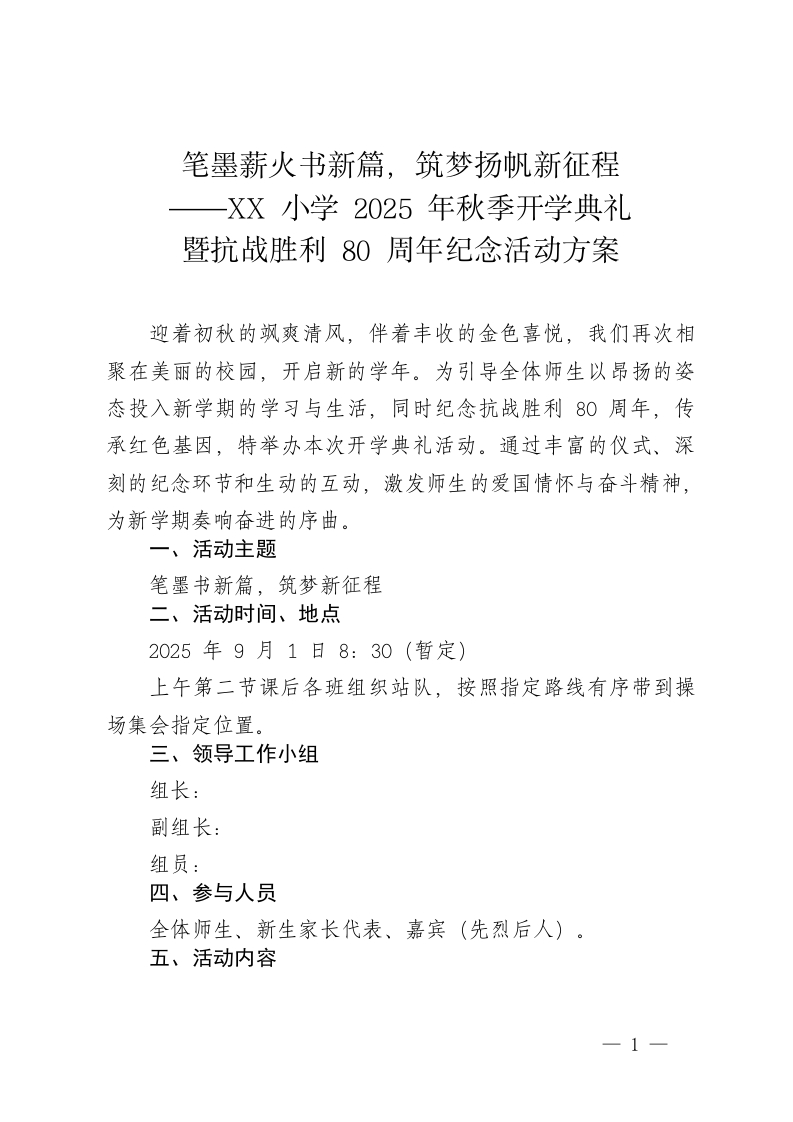 笔墨薪火书新篇,筑梦扬帆新征程—XX小学2025年秋季开学典礼暨抗战胜利80周年纪念活动方案迎着初秋的飒爽清风,伴着丰收的金色喜悦,我们再次相聚在美丽的校园,开启新的学年。为引导全体师生以昂扬的姿态投入新学期的学习与生活,同时纪念抗战胜利80周年,传承红色基因,特举办本次开学典礼活动。通过丰富的仪式、深刻的纪念环节和生动的互动,激发师生的爱国情怀与奋斗精神,为新学期奏响奋进的序曲。一、活动主题笔墨书新篇,筑梦新征程二、活动时间、地点2025年9月1日8:30(暂定)上午第二节课后各班组织站队,按照指定路线有序带到操场集会指定位置。三、领导工作小组组长:副组长:组员:四、参与人员全体师生、新生家长代表、嘉宾(先烈后人)。五、活动内容1