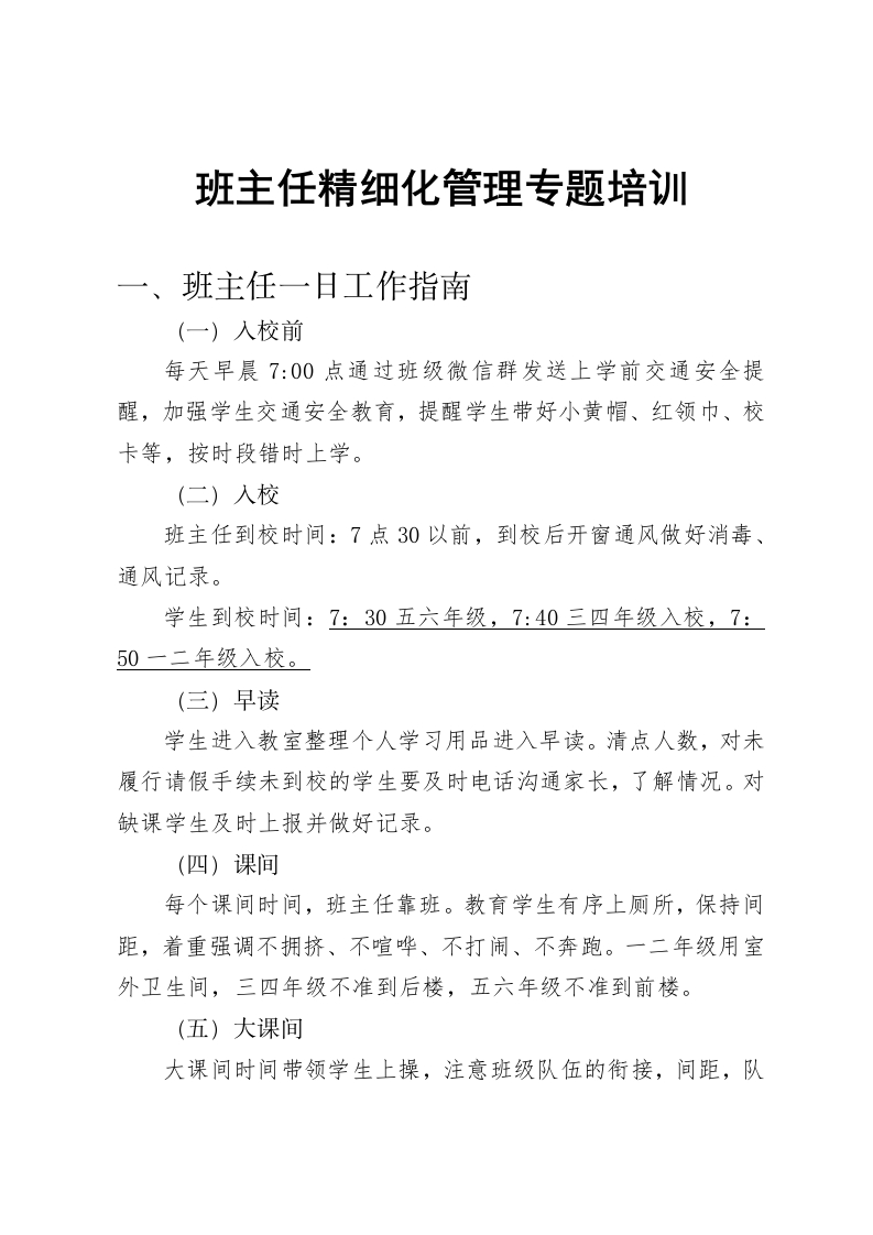 班主任精细化管理专题培训一、班主任一日工作指南每天早晨7:00点通过班级微信群发送上学前交通安全提醒,加强学生交通安全教育,提醒学生带好小黄帽、红领巾、校卡等,按时段错时上学。(二)入校班主任到校时间:7点30以前,到校后开窗通风做好消毒、通风记录。学生到校时间:7:30五六年级,7:40三四年级入校,7:50一二年级入校。(三)早读学生进入教室整理个人学习用品进入早读。清点人数,对未履行请假手续未到校的学生要及时电话沟通家长,了解情况。对缺课学生及时上报并做好记录。(四)课间每个课间时间,班主任靠班。教育学生有序上厕所,保持间距,着重强调不拥挤、不喧哗、不打闹、不奔跑。一二年级用室外卫生间,三四年级不准到后楼,五六年级不准到前楼。(五)大课间大课间时间带领学生上操,注意班级队伍的衔接,间距,队